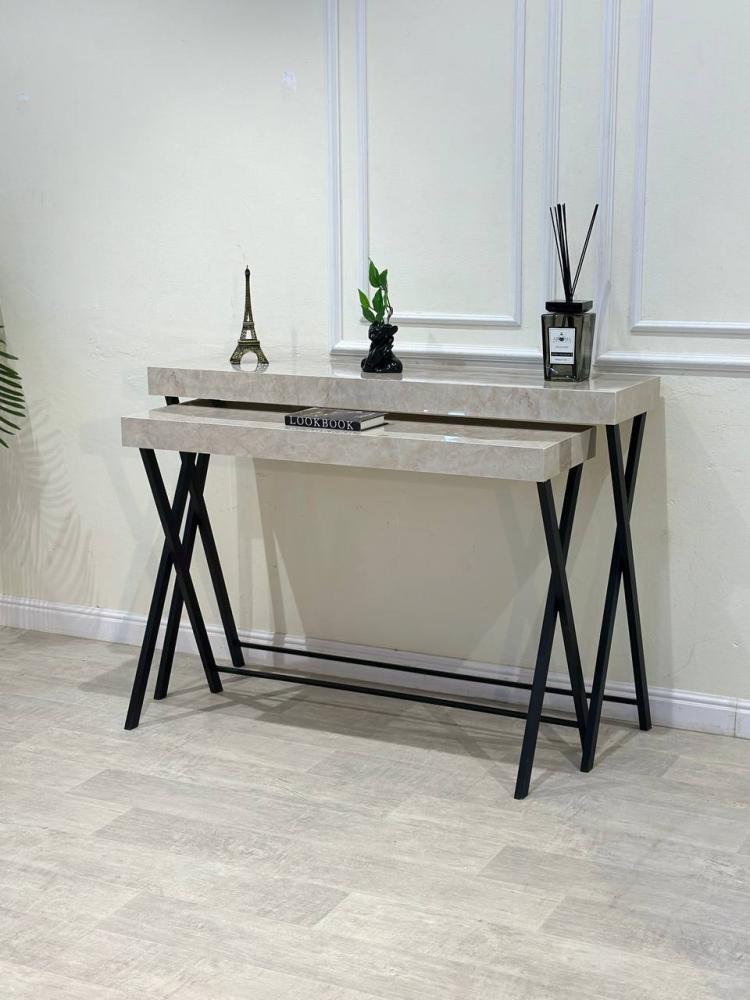أضف لمسة من الفخامة العصرية إلى مدخل منزلك مع طقم المدخل المميز بسطح بديل الرخام الأنيق وقاعدة حديد متينة بتصميم شكل X. يجمع بين القوة والمتانة وبين الأناقة الراقية، مع خيارات ألوان متعددة لتناسب جميع الأذواق: البني، الأسود، الذهبي، الشمباني.