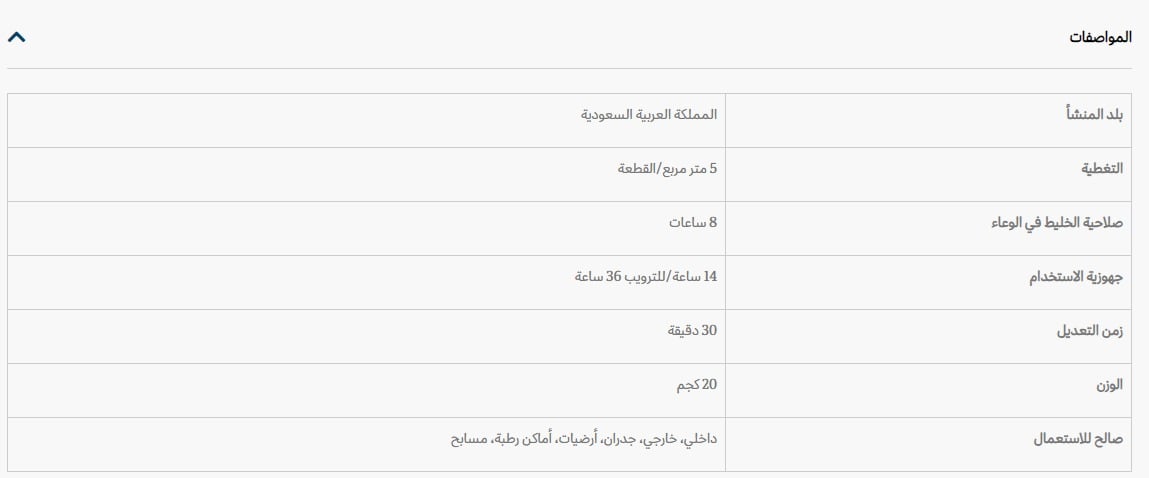 - صالح للاستعمال: داخلي وخارجي، جدران، أرضيات، أماكن رطبة، مسابح