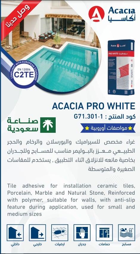 - غراء اكاسيا للبورسلان مناسب للبلاط بجميع أنواعه: بورسلان، سيراميك، رخام، حجر طبيعي.