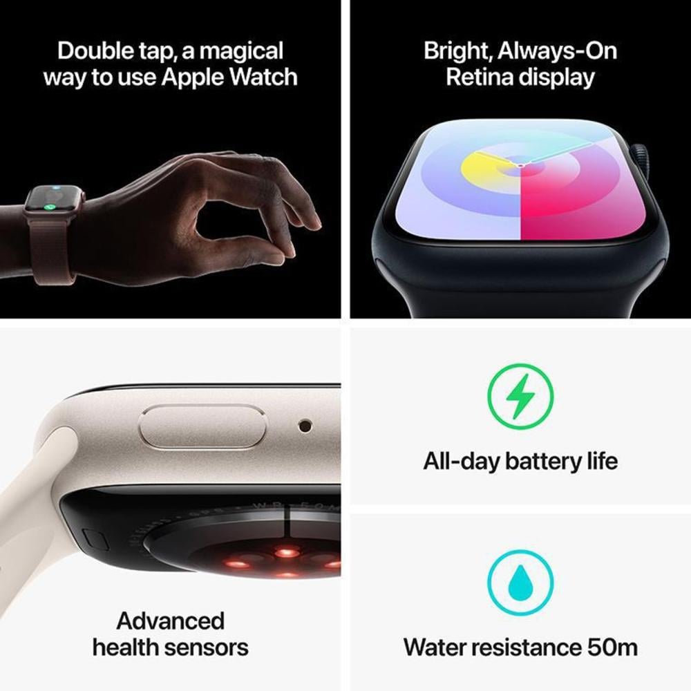 تتعاظم قدرات Apple Watch Series 9 ويزداد ذكاؤها وسرعتها بفضل شريحة Apple silicon المخصصة. فوحدة المعالجة المركزية ثنائية النواة تضم 5.6 مليار وحدة ترانزستور- 60 بالمئة أكثر مقارنة بشريحة S8. أما المحرك العصبي رباعي النوى فهو أسرع لغاية مرتين في معالجة مهام التعلم الآلي. وكل هذا فتح المجال لمجموعة من الابتكارات الرائعة منها حركة الضغط مرتين.