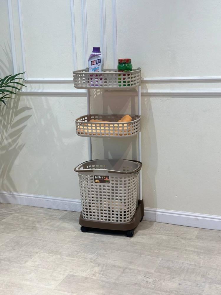 منتج عبارة عن رف تخزين بلاستيكي متعدد الاستخدامات، مصمم بثلاثة أدوار لتلبية احتياجات التخزين المختلفة في المنزل.