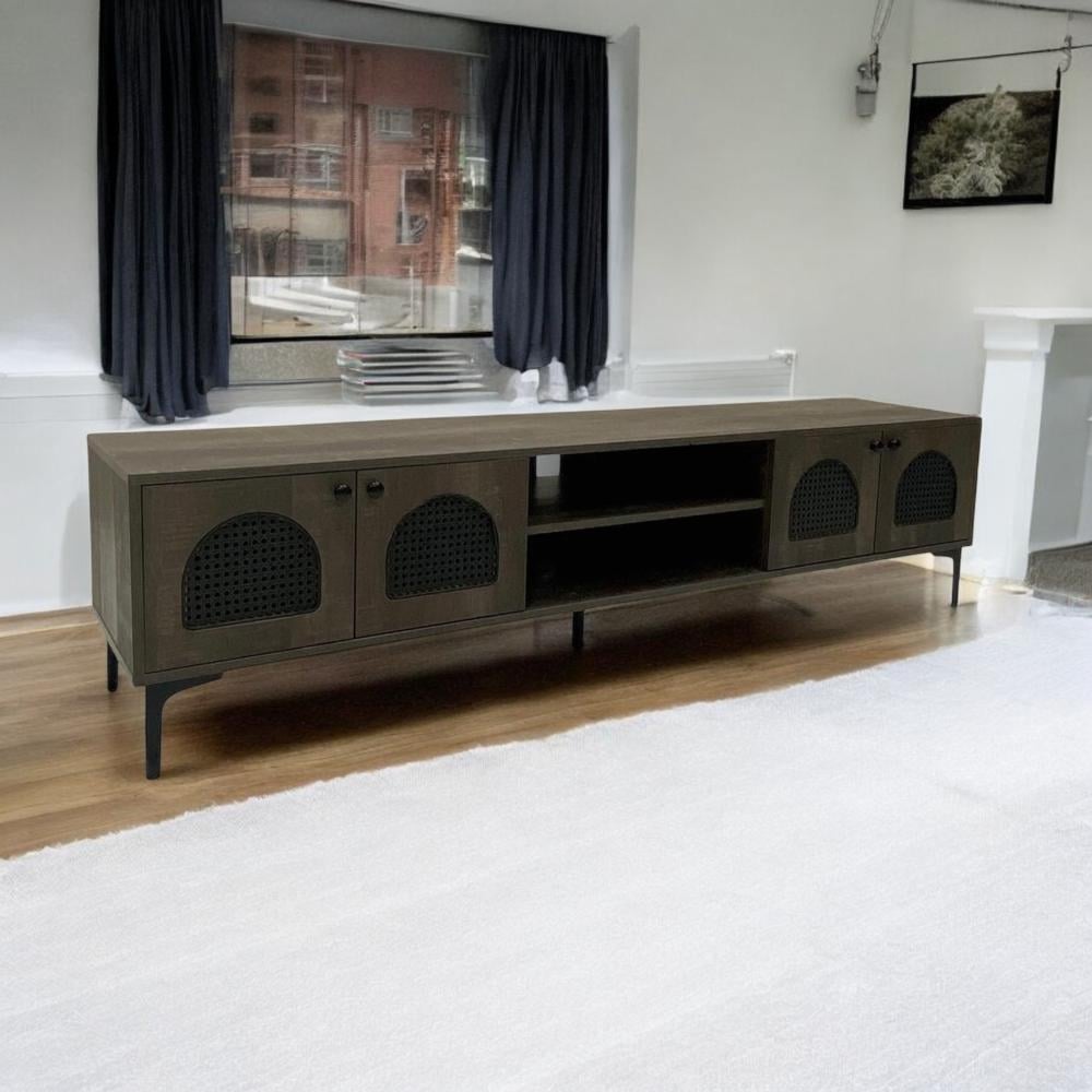 - الخامة: مصنوعة من خشب فائق الجودة ومزين بتفاصيل منسوجة يدويًا من الروتان لتوفير مظهر دافئ وأنيق.