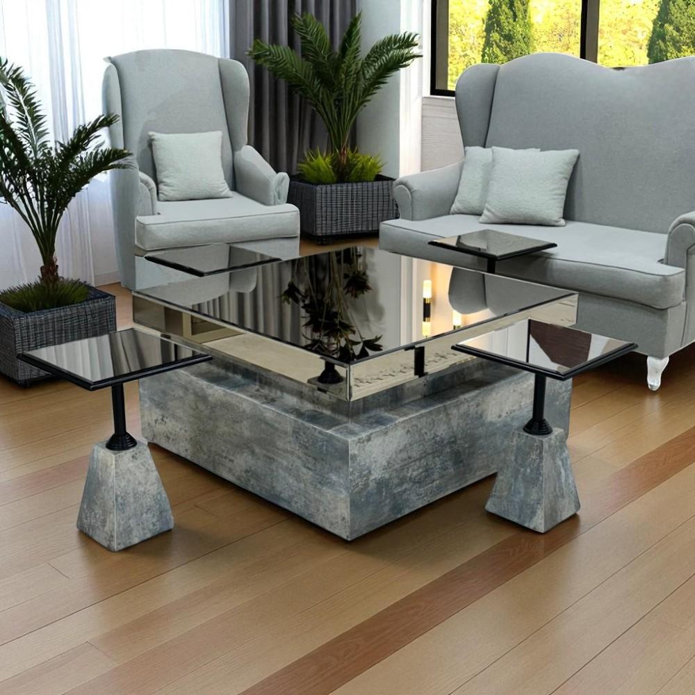 - سطح زجاجي مصقول مع قاعدة حجرية بديل الرخام مميزة تحاكي الرخام الفاخر، تضفي طابعًا فريدًا على المساحة.