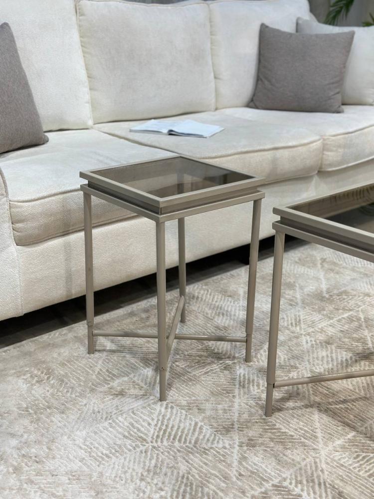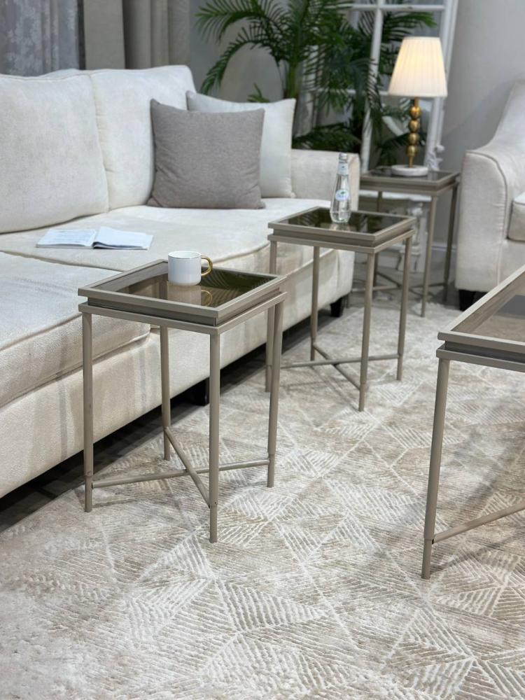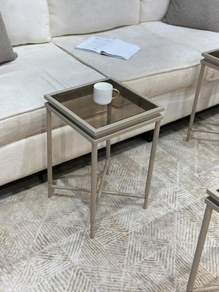 مصنوعة بقاعدة حديد باللون الشمباني وسطح زجاجي بني شفاف فاخر يعكس الذوق الرفيع في كل تفاصيله.