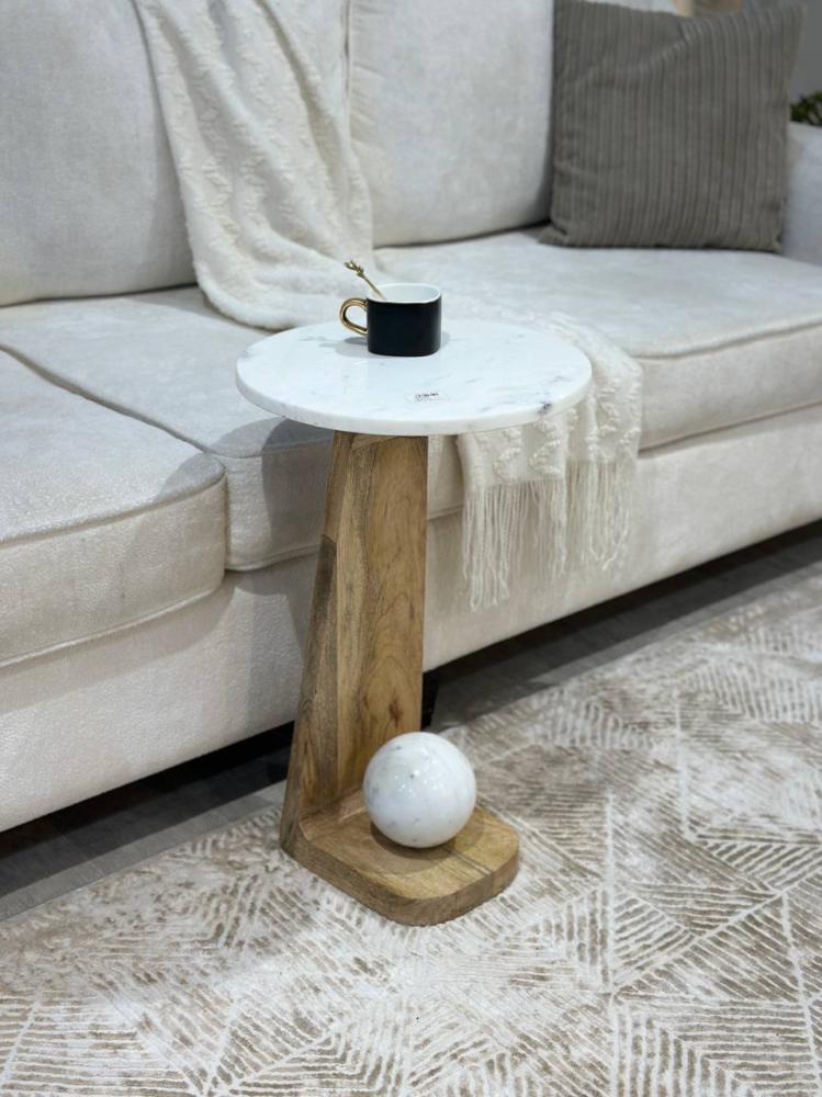 طاولة ضيافة أو طاولة جانبية بتصميم فاخر، تجمع بين سطح رخامي أنيق وقاعدة دائرية (كور) بلون خشبي دافئ. مثالية لإضافة لمسة فخامة وعصرية لأي مجلس أو زاوية ضيافة.
