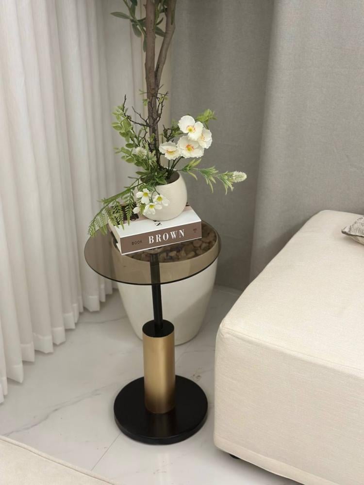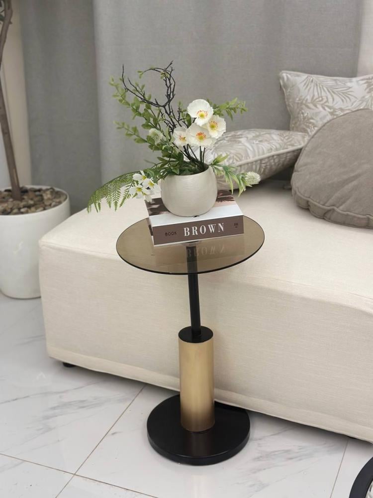 تتميز الطاولة بقاعدة مصنوعة من رخام أسود فاخر يمنحها مظهرًا متينًا وثابتًا، بينما يضفي السطح الزجاجي الشفاف بدرجة داكنة أنيقة لمسة من العمق والرقي.