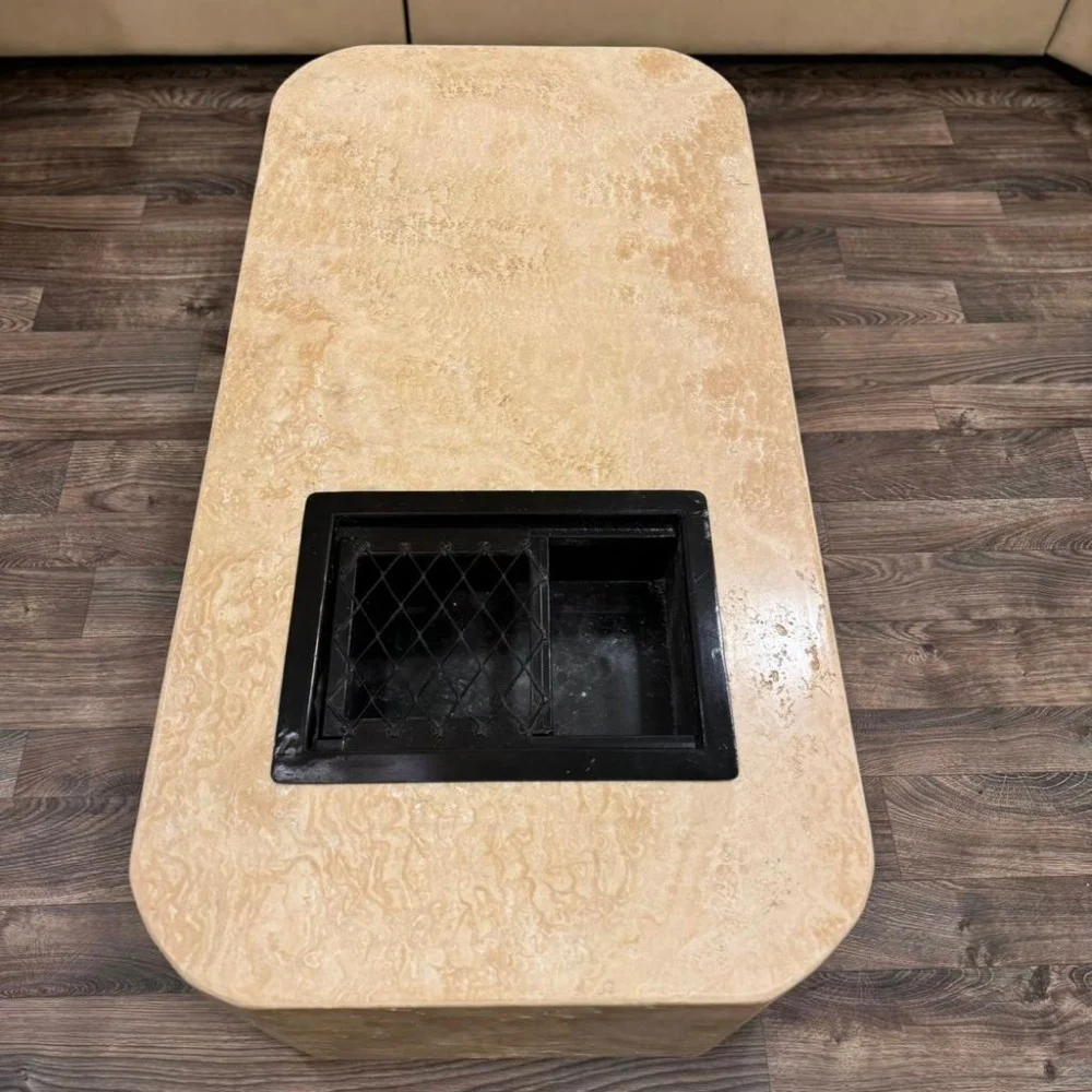 طاولة رخامية ثابتة، وهي قطعة أثاث منزلية مصنوعة من الرخام وتتميز بمنقل متحرك وسهل التنظيف.