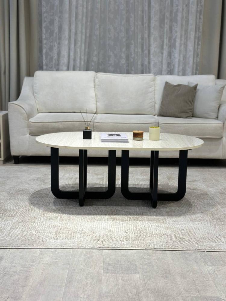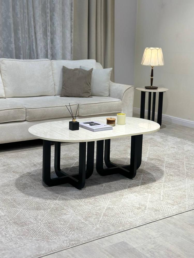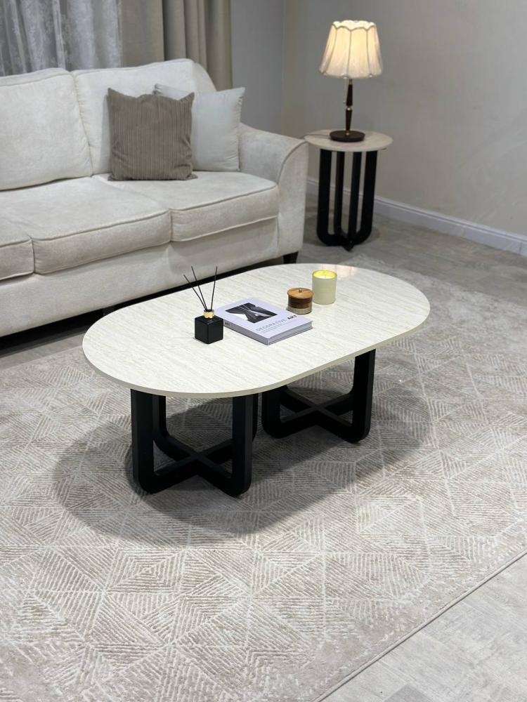 أضف لمسة من الأناقة والتميز إلى غرفة المعيشة أو صالون الضيوف مع هذه الطاولة الفريدة بسطح بديل الرخام وقواعد خشبية باللون الأسود بتصميم هندسي مميز. تصميمها البيضاوي يجعلها قطعة مثالية تجمع بين الجمال والعملية، لتكون مركز الانتباه في أي مساحة.