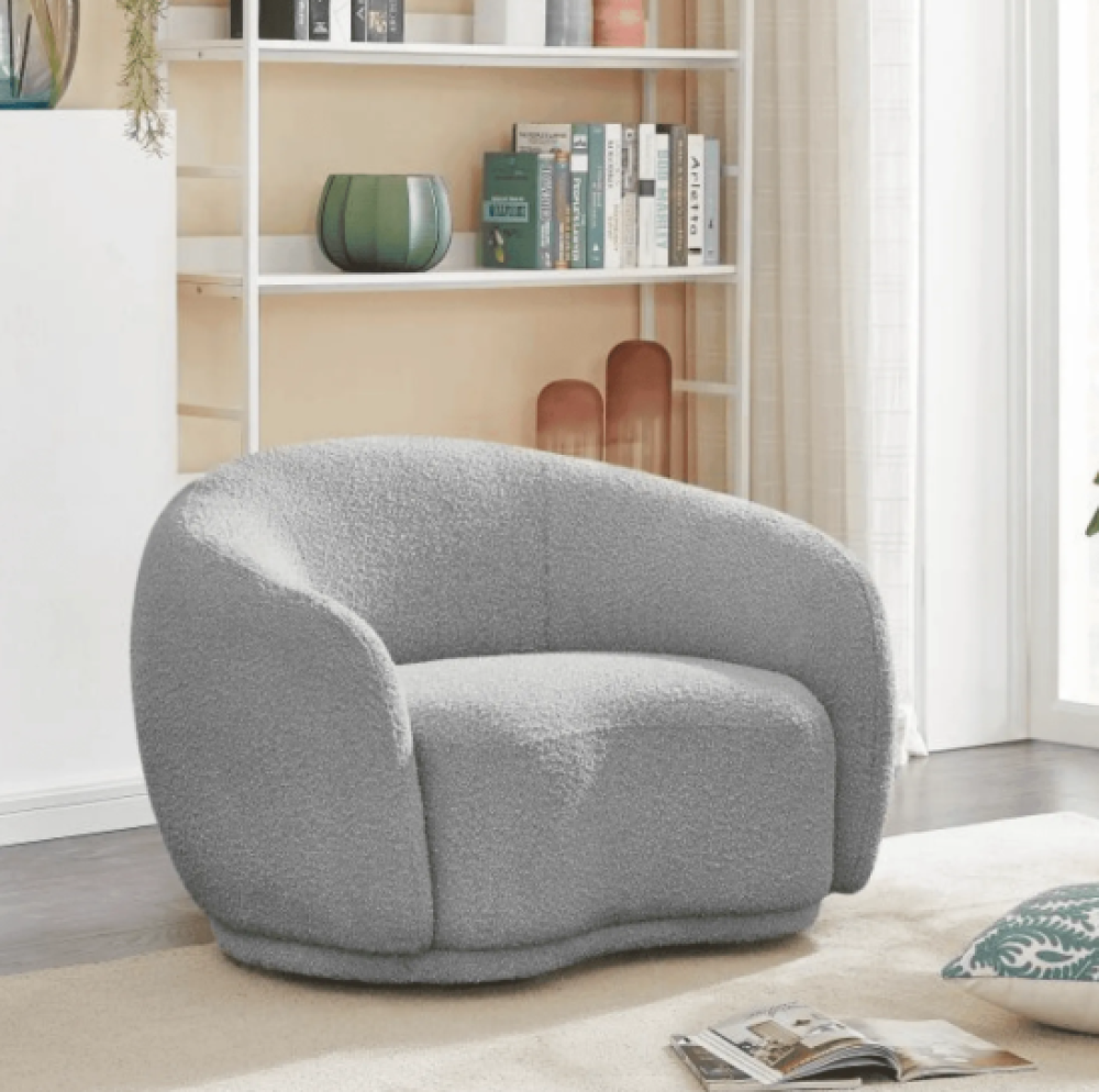 - التصميم: أريكة عصرية بظهر مستدير يضفي إحساسًا بالفخامة والانسيابية، مع خطوط ناعمة وأنيقة تناسب جميع الديكورات.