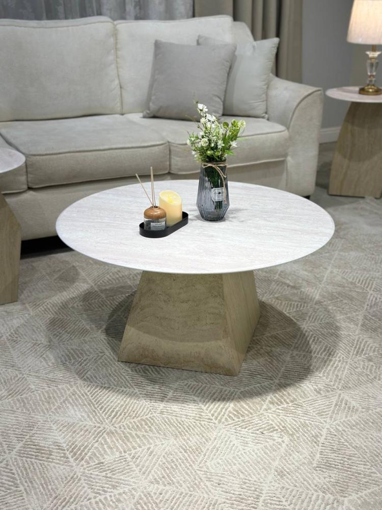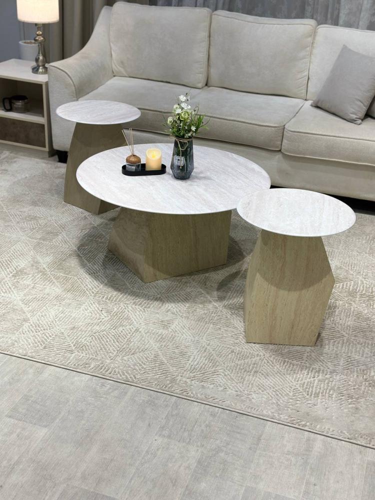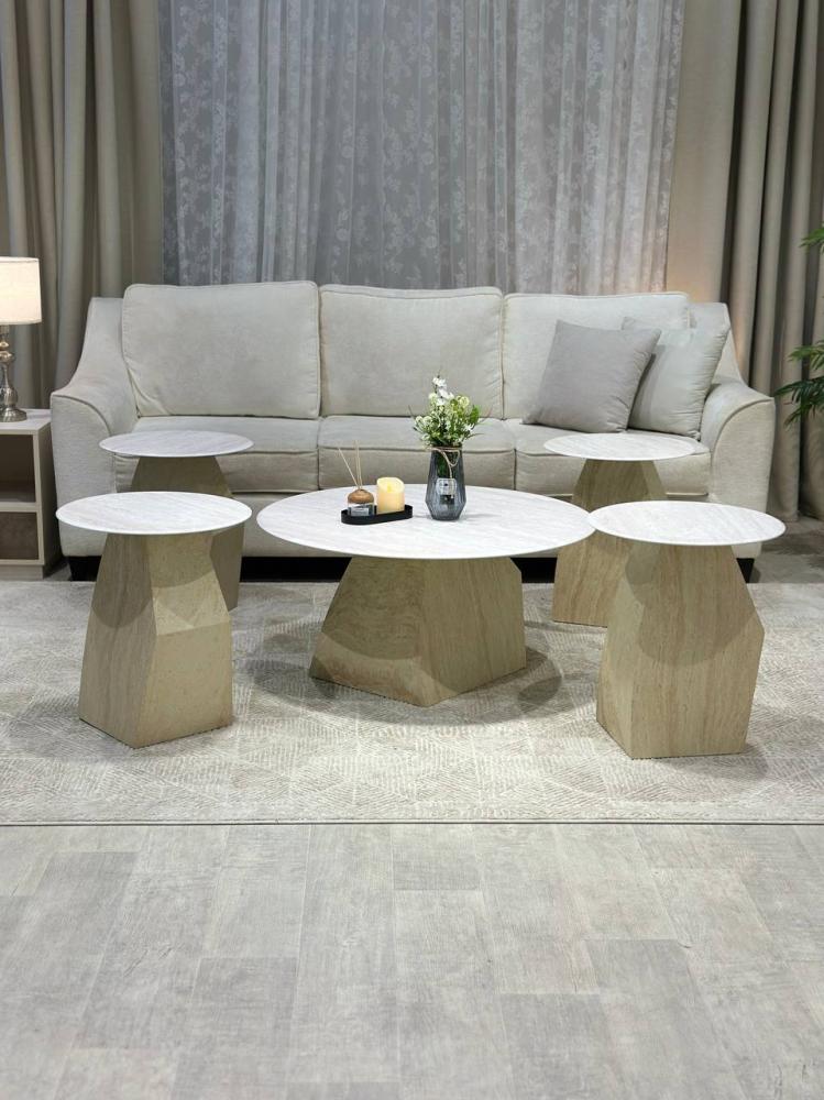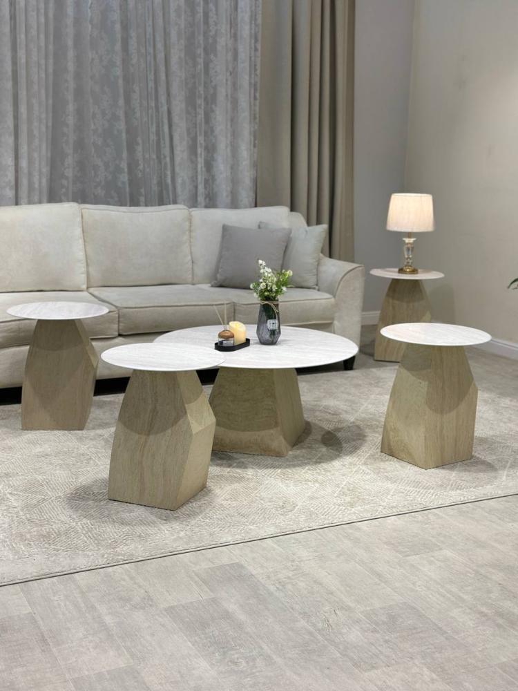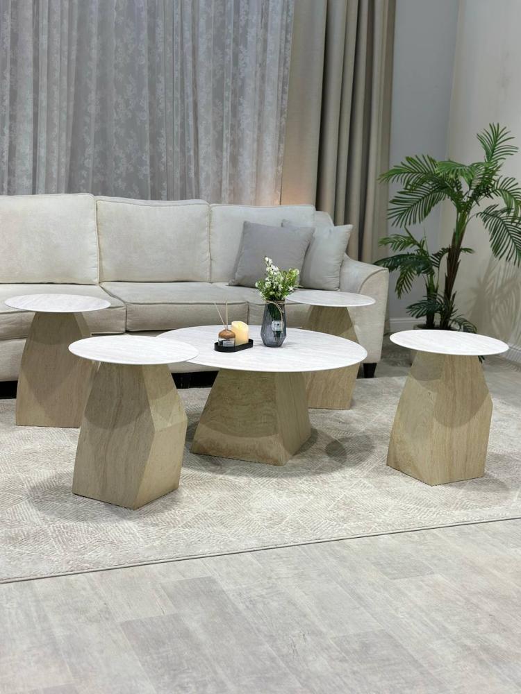 - أضف لمسة من الفخامة العصرية إلى منزلك مع طقم الطاولات الفاخر بتصميم بديل السيراميك وقاعدة خشبية أنيقة تجمع بين المتانة والأناقة. يتميز الطقم بتصميمه العملي والمميز الذي يجمع بين الشكل الجمالي والوظيفة، ليضفي لمسة راقية على غرفة المعيشة أو الجلسات.
