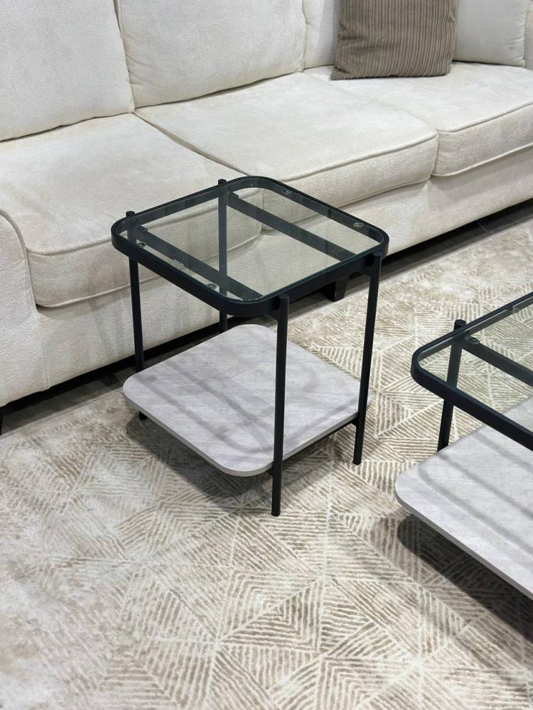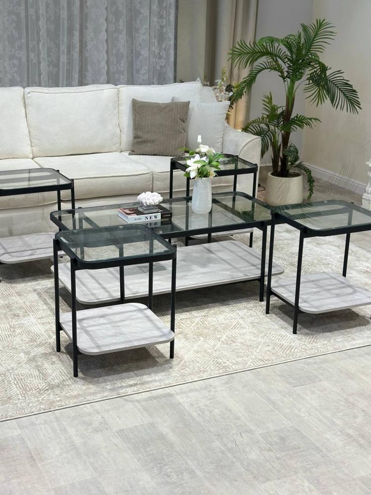 طقم طاولات مميز مكون من 5 قطع بتصميم عصري يجمع بين الشفافية والأناقة، يأتي بسطح زجاجي شفاف يمنح المساحة إحساساً بالرحابة، ورف سفلي من الخشب العملي يضيف لمسة دفء ووظائفية.