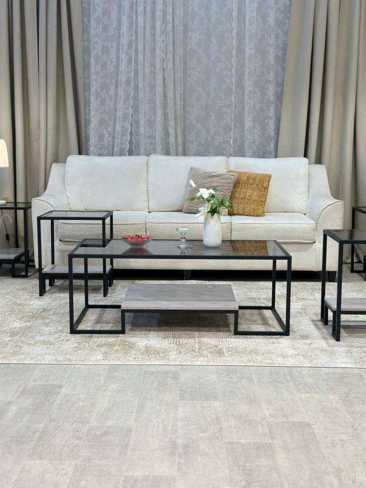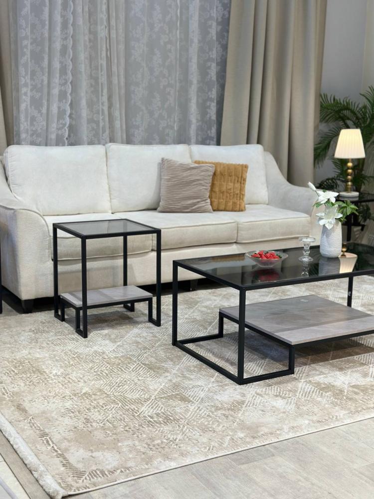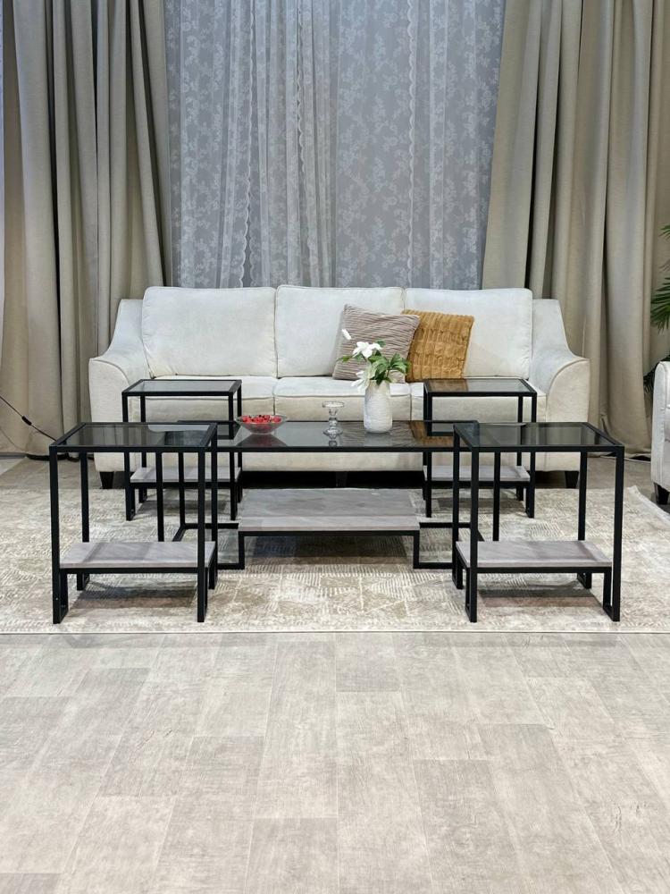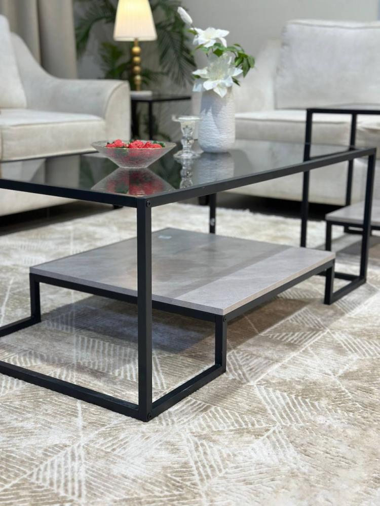 الرقي العصري لقلب منزلك. يتألف الطقم من خمس قطع متكاملة، تتميز بتصميم دورين يجمع بين العملية والجمال، مع أسطح زجاجية شفافة تعكس الضوء وتضفي اتساعًا بصريًا على المساحة. يرتكز الطقم على قواعد معدنية سوداء أنيقة، مما يمنحه ثباتًا ومتانة، ويجعله إضافة مثالية لغرفة المعيشة أو الصالون، حيث يمزج بين الفخامة والبساطة ليضفي سحرًا خاصًا على ديكورك