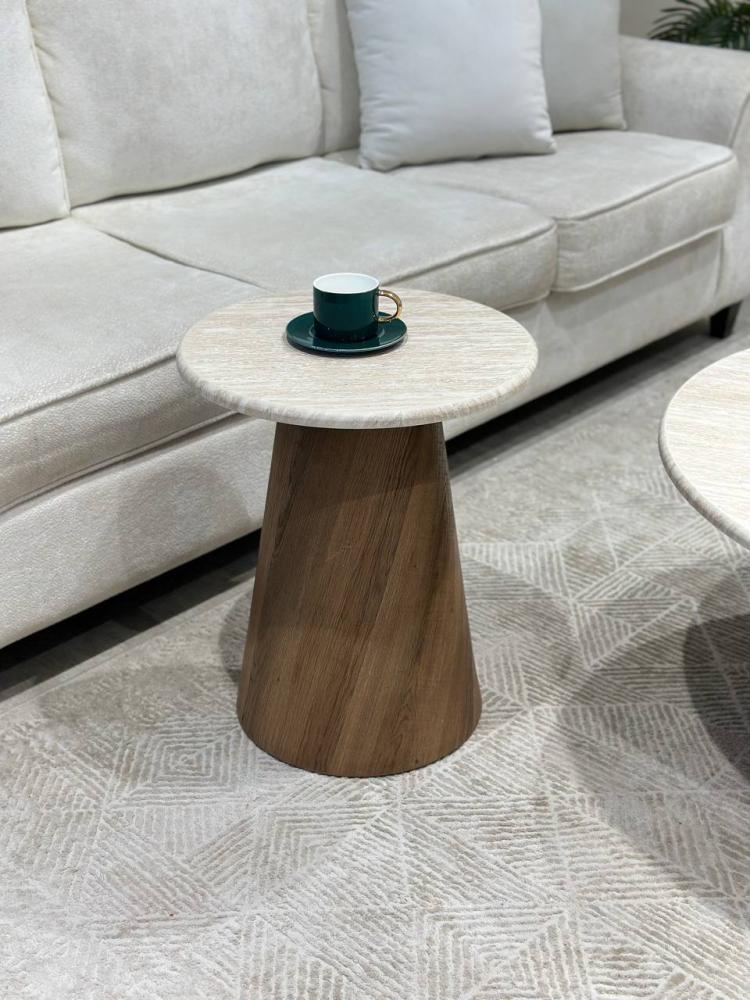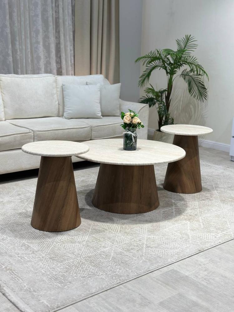 الطاولة الرئيسية مثالية لتقديم الضيافة في وسط الجلسة، بينما توفر طاولات الخدمة الجانبية مرونة عالية في الاستخدام لتقديم المشروبات أو تزيين الزوايا بلمسة فنية.