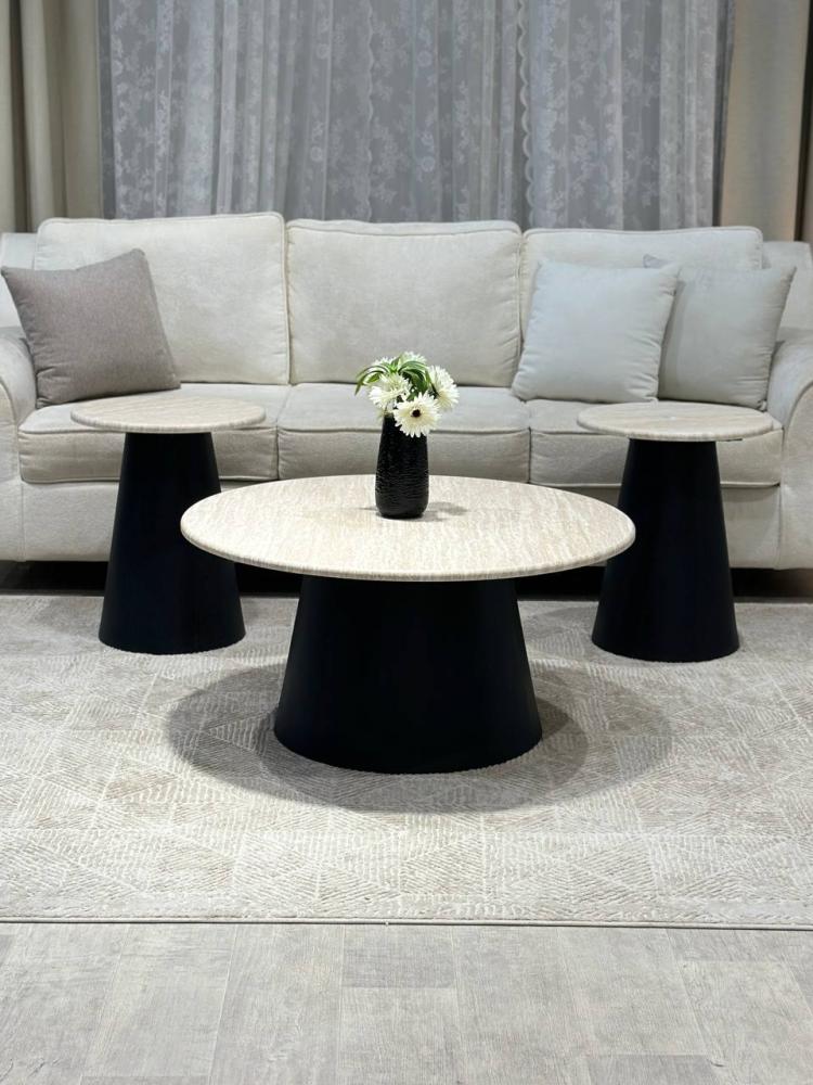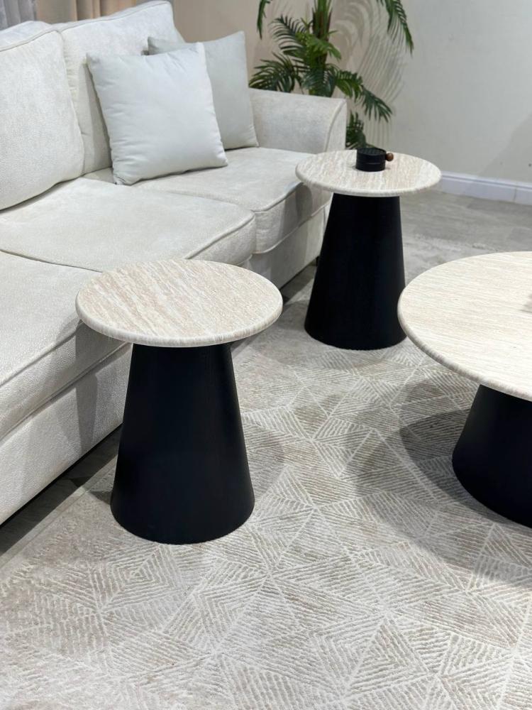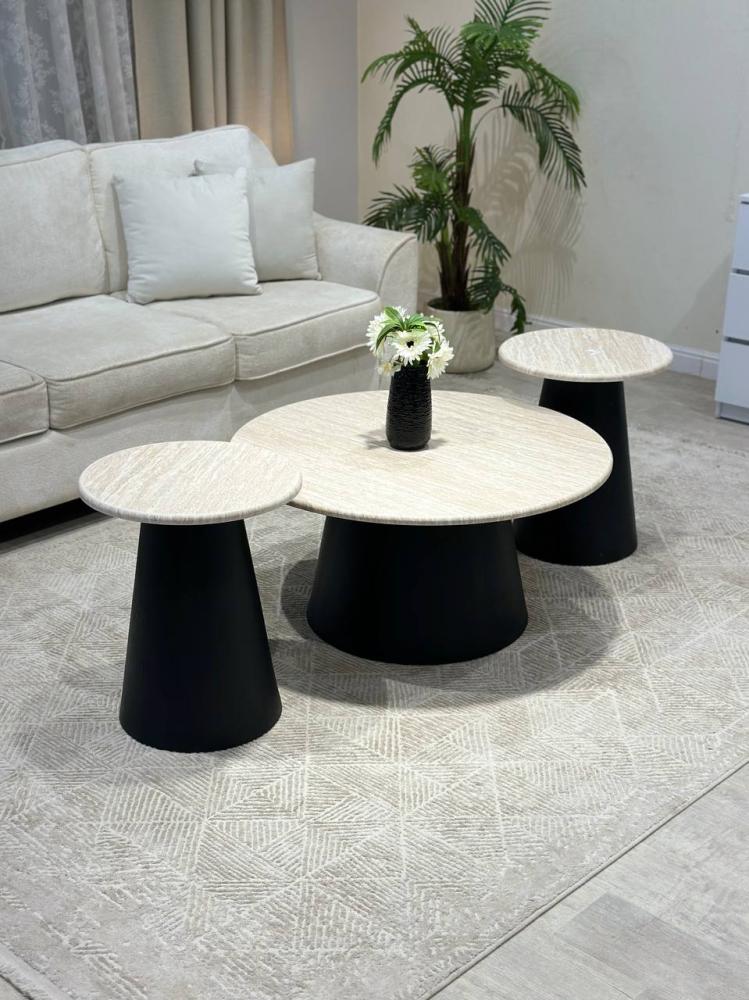الطاولة الرئيسية مثالية لتقديم الضيافة في وسط الجلسة، بينما توفر طاولات الخدمة الجانبية مرونة عالية في الاستخدام لتقديم المشروبات أو تزيين الزوايا بلمسة فنية.