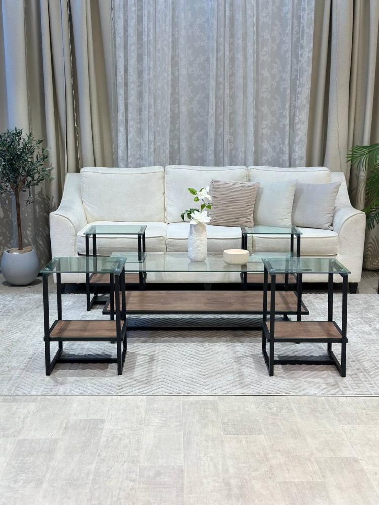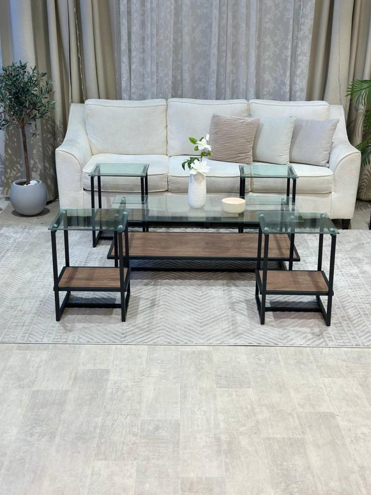 • المواد: يتكون الطقم من هيكل خشبي بني مع سطح زجاجي شفاف. الخشب يضيف طابعًا دافئًا وطبيعيًا، بينما يضفي الزجاج الشفاف مظهرًا عصريًا.
