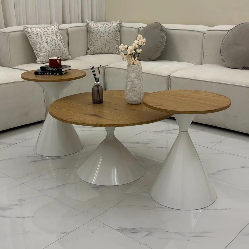 • طقم طاولات ضيافة 3 قطع بسطح خشب بيج قاعدة لون أبيض :