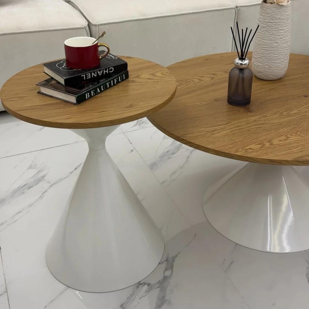 • الخامة: سطح الطاولات مصنوع من الخشب عالي الجودة بلون بيج ، مع قاعدة لون أبيض متينة تضمن الثبات.