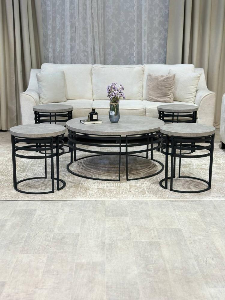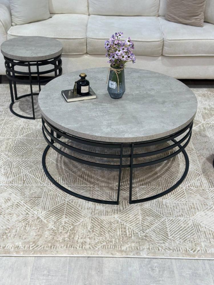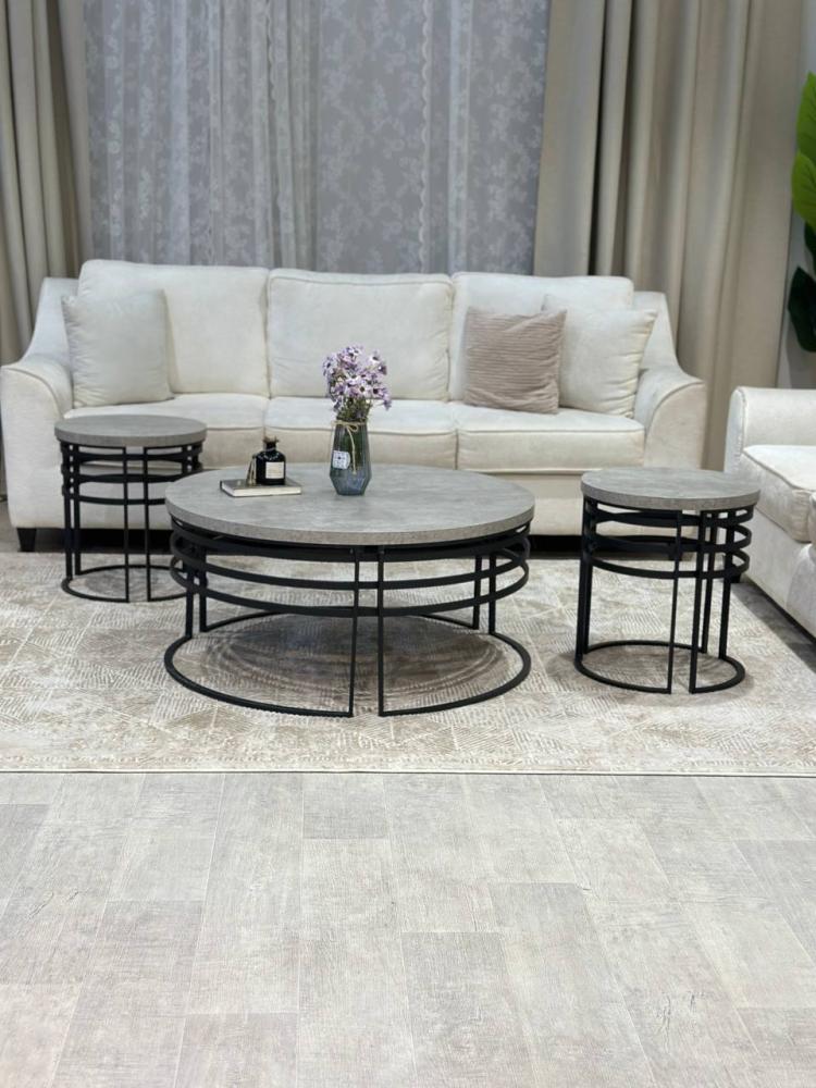 - يجمع الطقم بين متانة المعدن الأسود وقوة وجاذبية السطح الرمادي المتين مما يجعله مناسبًا للديكورات الحديثة والمعاصرة. التصميم الدائري للطاولات يضفي لمسة من النعومة والانسيابية على المساحة.