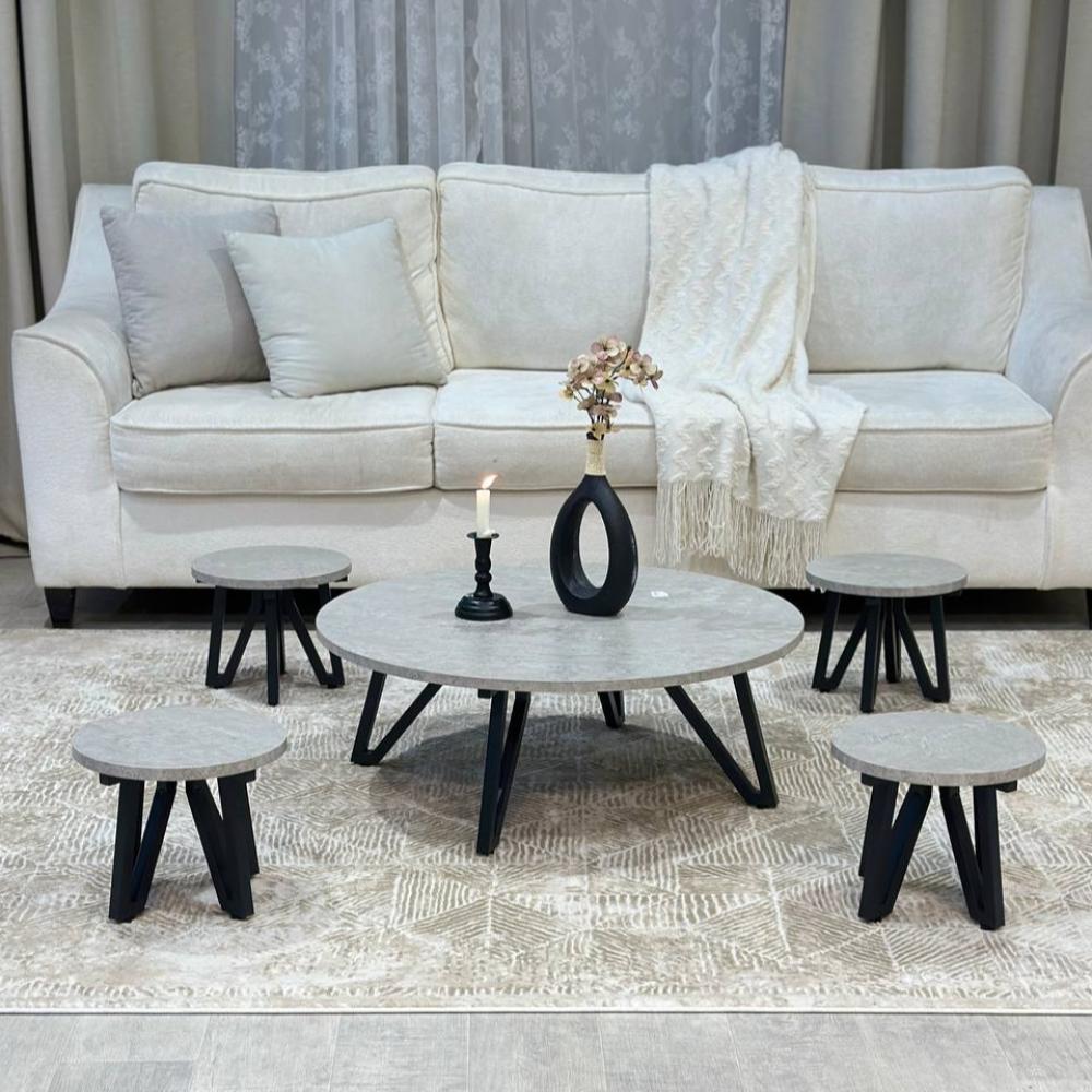 طقم طاولات أرضية مكوّن من طاولة رئيسية وأربع طاولات خدمة، بتصميم دائري بسيط وأنيق،