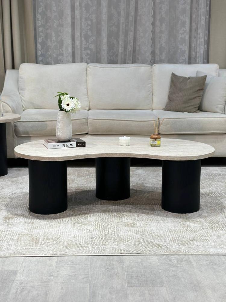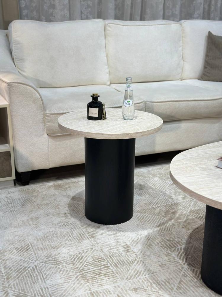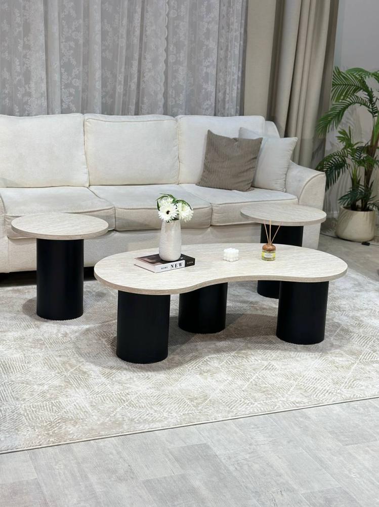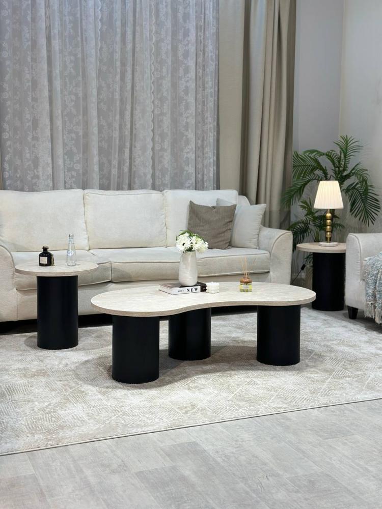 يتميز الطقم بسطح فاخر من بديل الرخام وقواعد خشبية بلون اسود دافئ تضفي دفئاً وأناقة على أي مساحة.