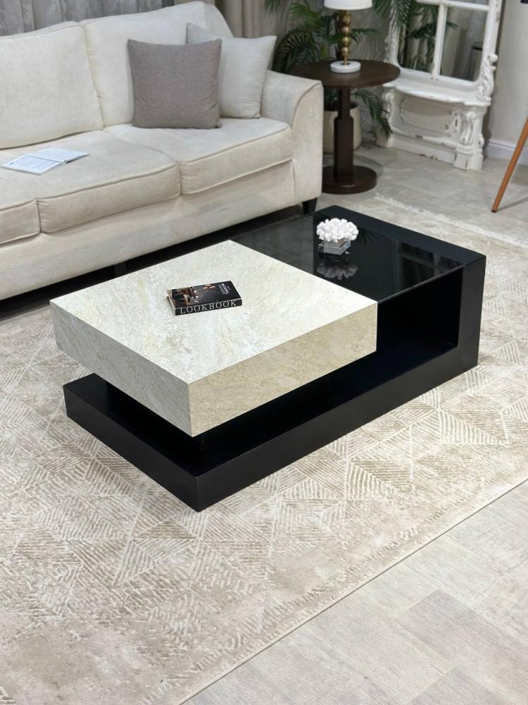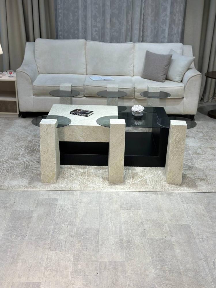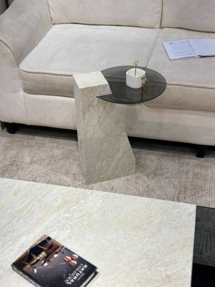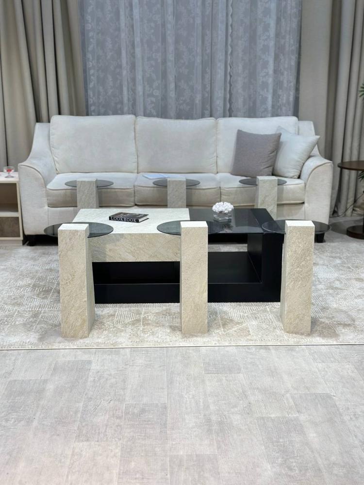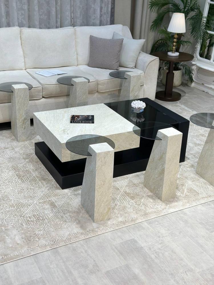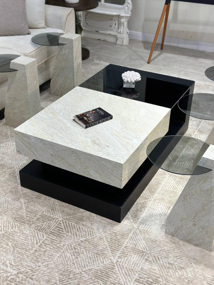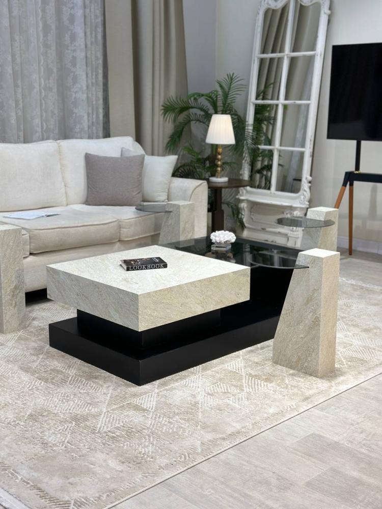 طاولات الخدمة تأتي بسطح زجاج أسود أنيق مع قاعدة بديل رخام كاملة، لتكون مثالية لتقديم الضيافة بأناقة.
