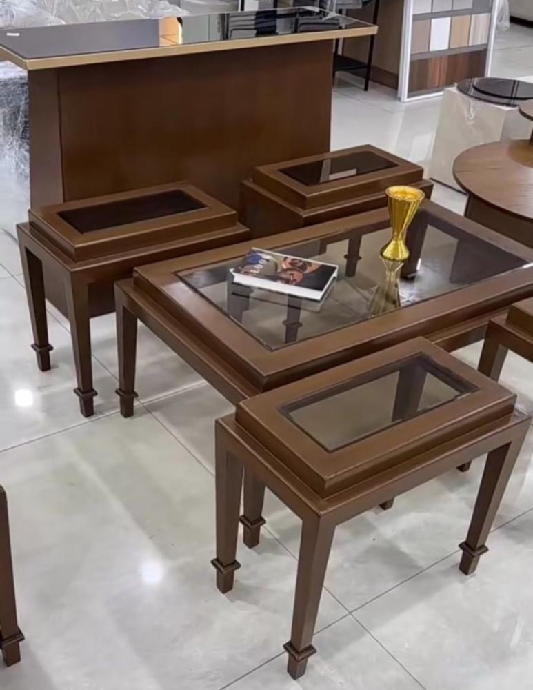 طقم فاخر بتصميم عصري يخطف الأنظار! سطح زجاجي شفاف لامع يعكس الإضاءة بشكل جذاب وقاعدة متينة تضمن الأناقة والثبات معاً.