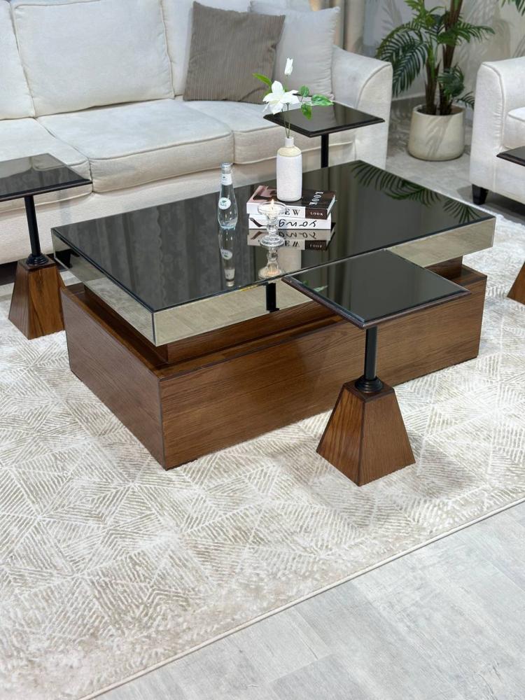 - طقم طاولة ضيافة يجمع بين الطاولة الرئيسية مع 4 طاولات خدمة إضافية بشكل عصري، مما يضفي مظهرًا أنيقًا على أي غرفة.