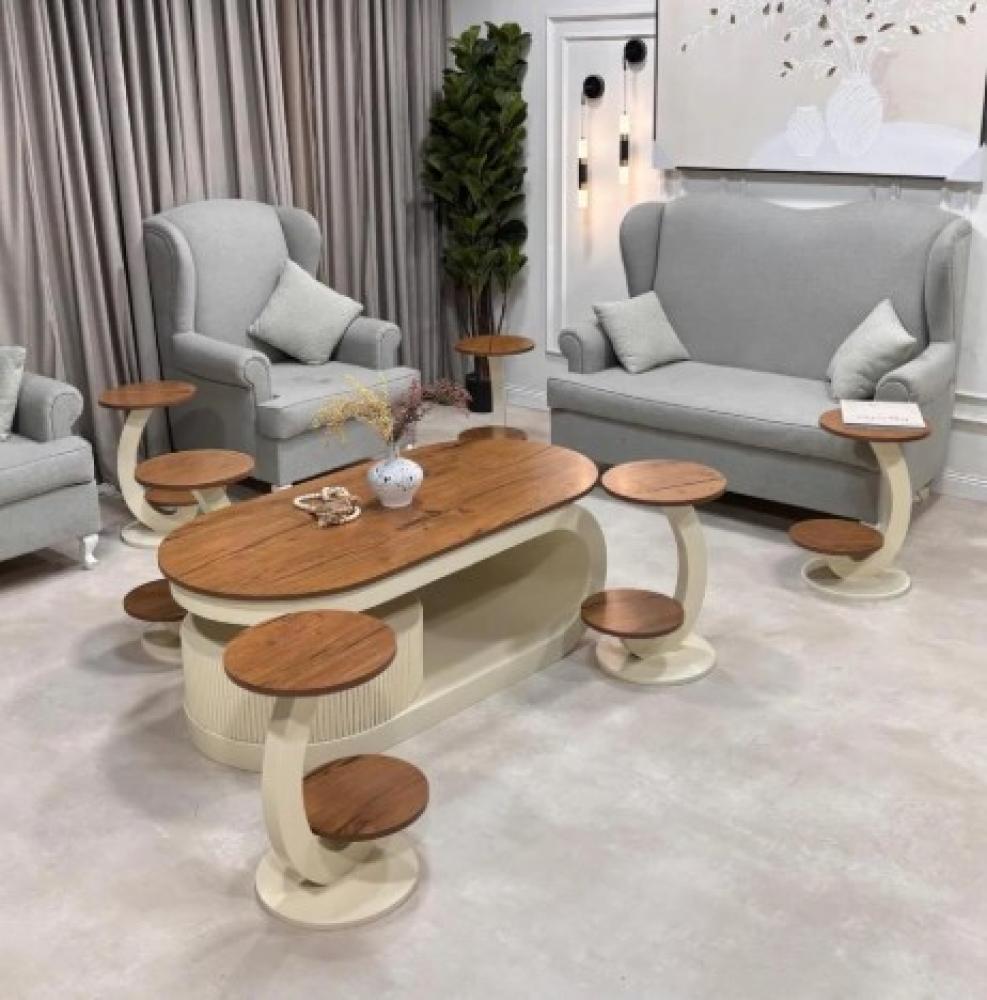 يتكون الطقم من طاولة رئيسية بتصميم مستطيل واسع، يرافقها 6 طاولات خدمة دائرية مثالية للاستخدام اليومي والضيافة.
