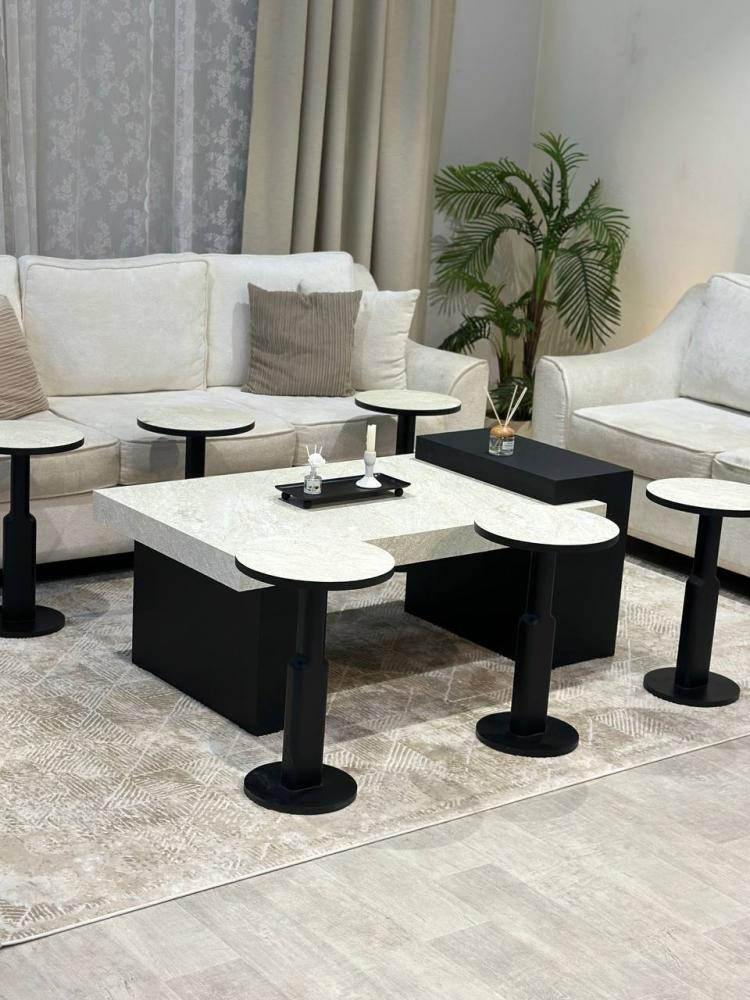 - يوفر الطقم مساحات متعددة للتقديم أو عرض الديكورات، كما أن السطح المقاوم للخدوش والبقع يجعلها سهلة التنظيف والصيانة