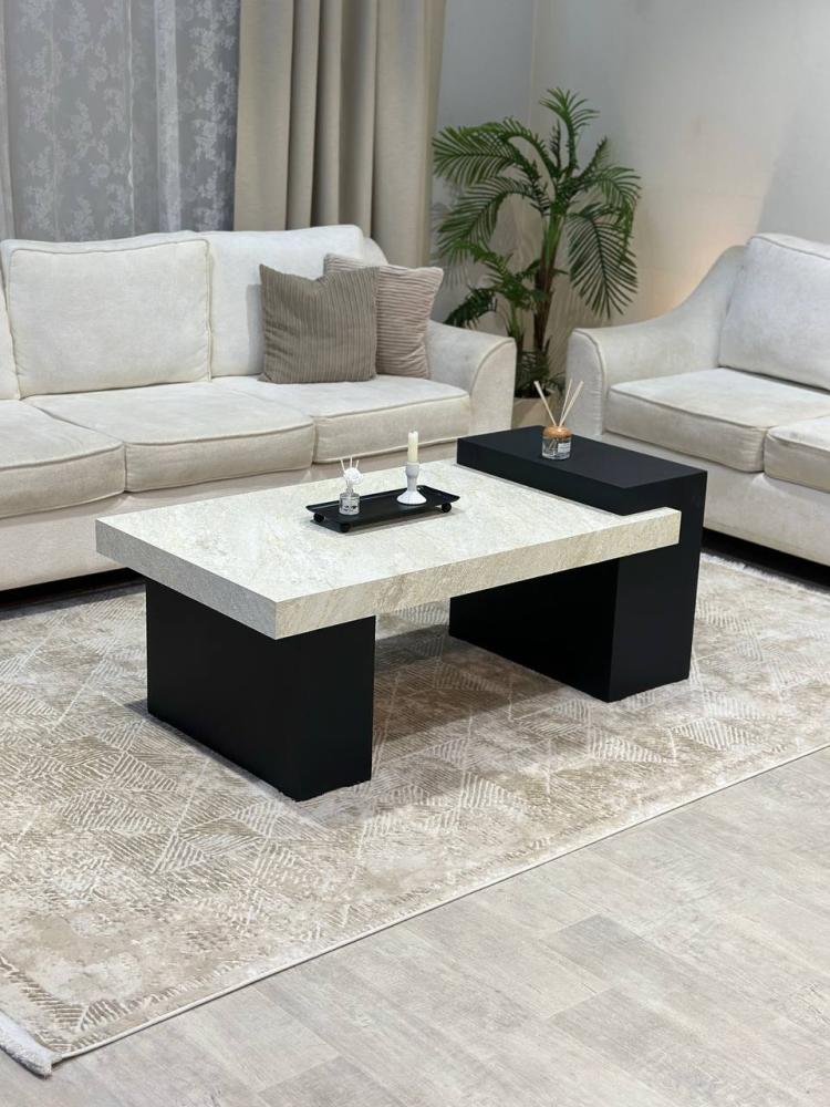 - طاولة قهوة مستطيلة كبيرة ذات سطح بديل للرخام ذو ملمس ناعم، وقاعدة خشبية غالباً من قشرة السنديان أو خشب السنديان الصلب.
