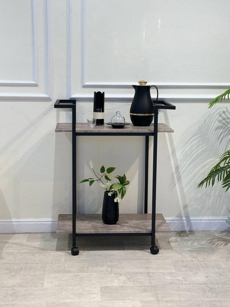 عربة تقديم دورين خشب رمادي تتميز بالتصميم العصري والعملي، مع مميزات تشمل: