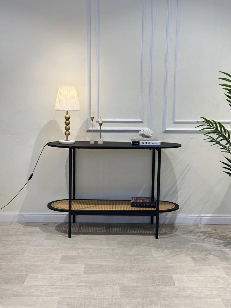 أضف لمسة من الفخامة والأناقة إلى منزلك مع هذا المدخل العصري المصمم بشكل بيضاوي مميز. يأتي بدورين لزيادة الوظائف العملية، مع سطح خشبي أنيق ولمسات من الراتان الفاخر في الأسفل تضفي لمسة طبيعية دافئة.