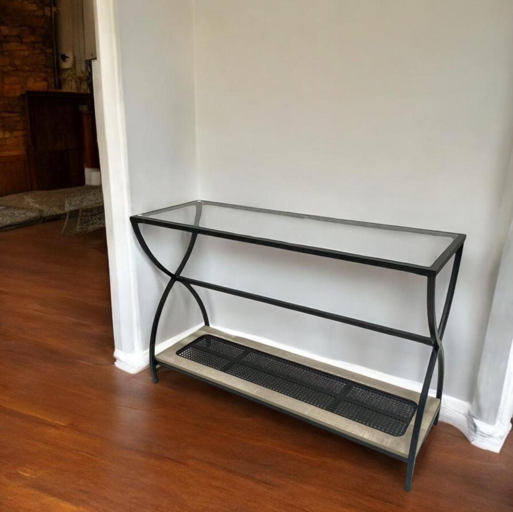 "مدخل دورين بتصميم راقٍ يجمع بين العملية والجمال. يتميز السطح الزجاجي الأنيق بجودة عالية، ما يضفي مظهرًا عصريًا ويعكس الإضاءة بشكل مثالي، مع قاعدة وأرفف مصنوعة من الخشب الطبيعي بتشطيبات دقيقة ومزينة بتفاصيل من الرتان الفاخر.