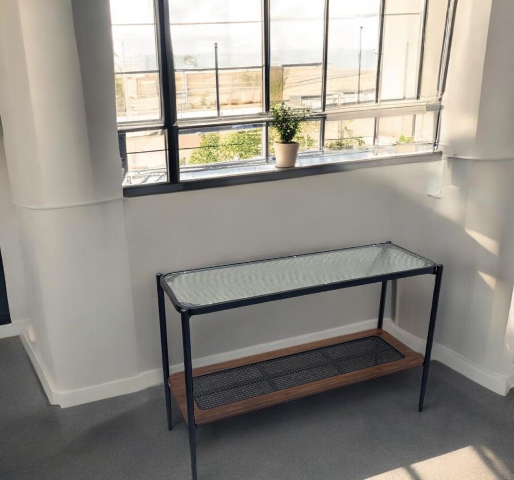 مدخل مصنوع من زجاج مع أرجل حديد وتصميم مستوحى من الرَوتان هو قطعة أنيقة تجمع بين الطابع العصري والطبيعي.