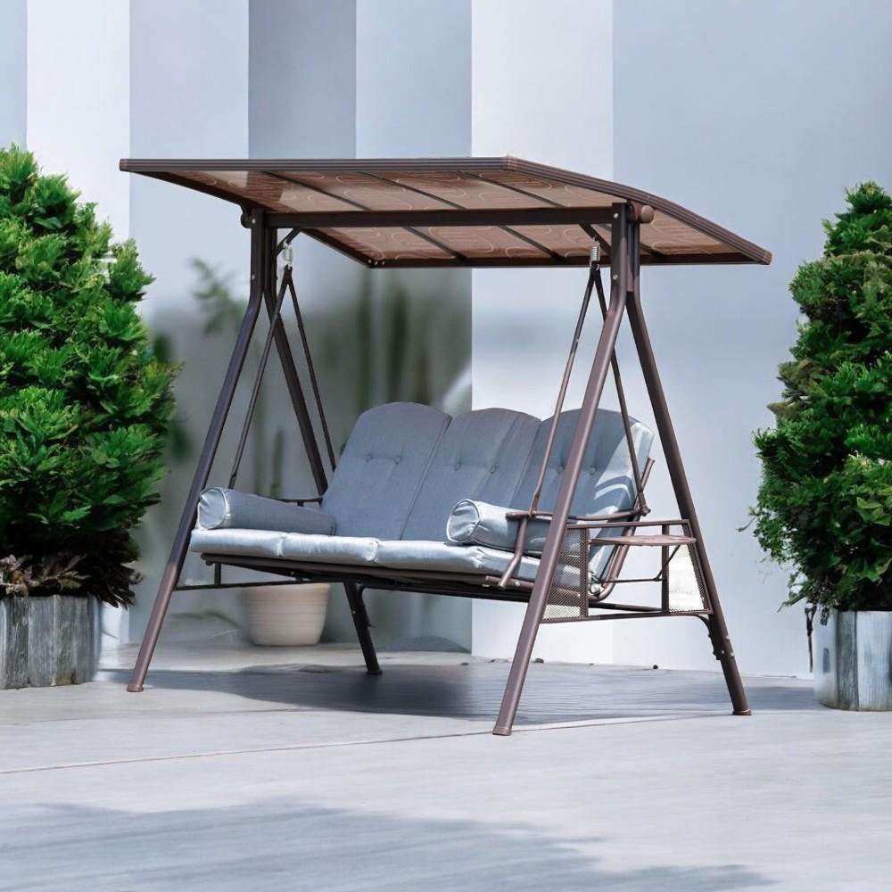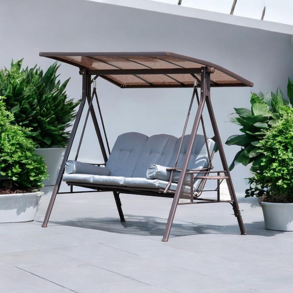 استمتع بالاسترخاء والراحة مع مرجيحه حوش مصممة بثلاثة مقاعد لتوفير تجربة جلوس ممتعة للمنازل والحدائق، مع مواد معدنية قوية ومظلة زجاجية لحماية المستخدمين من أشعة الشمس.