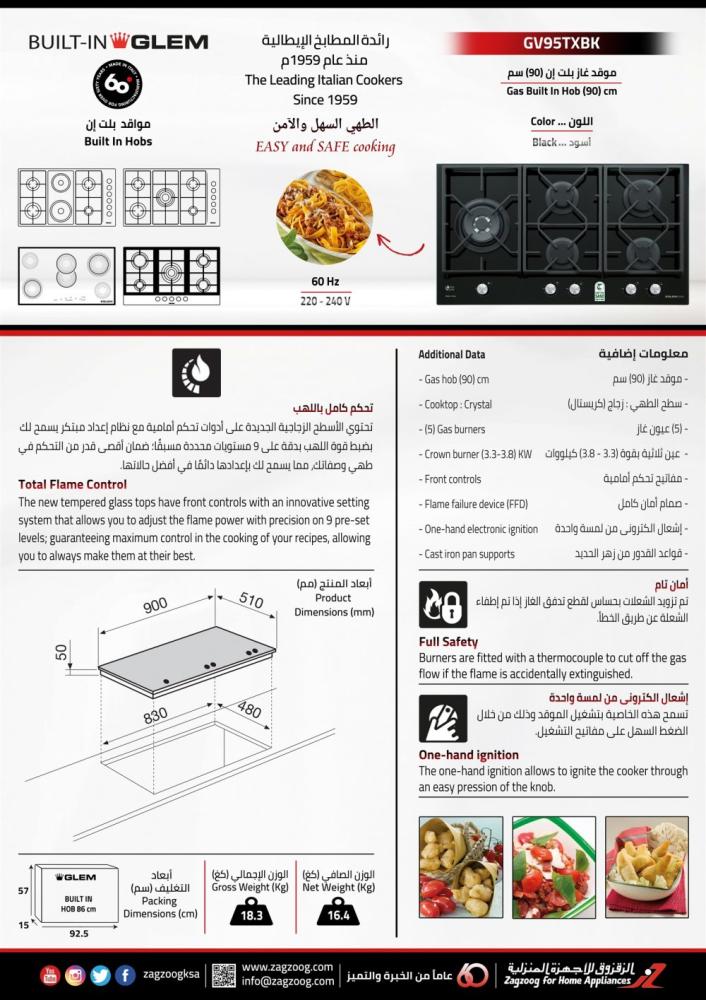 موقد جليم بلت إن - غاز (90) سم ، (5) شعلات ، مفاتيح التحكم أمامية