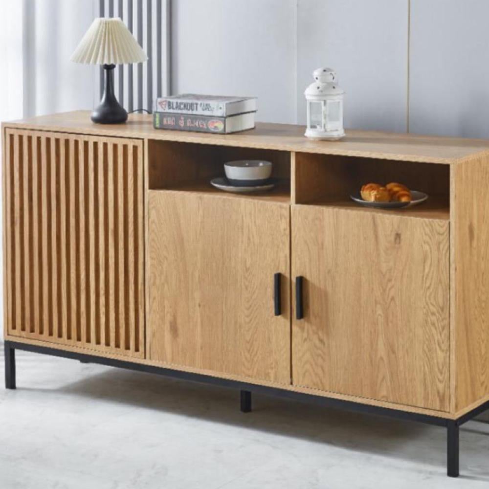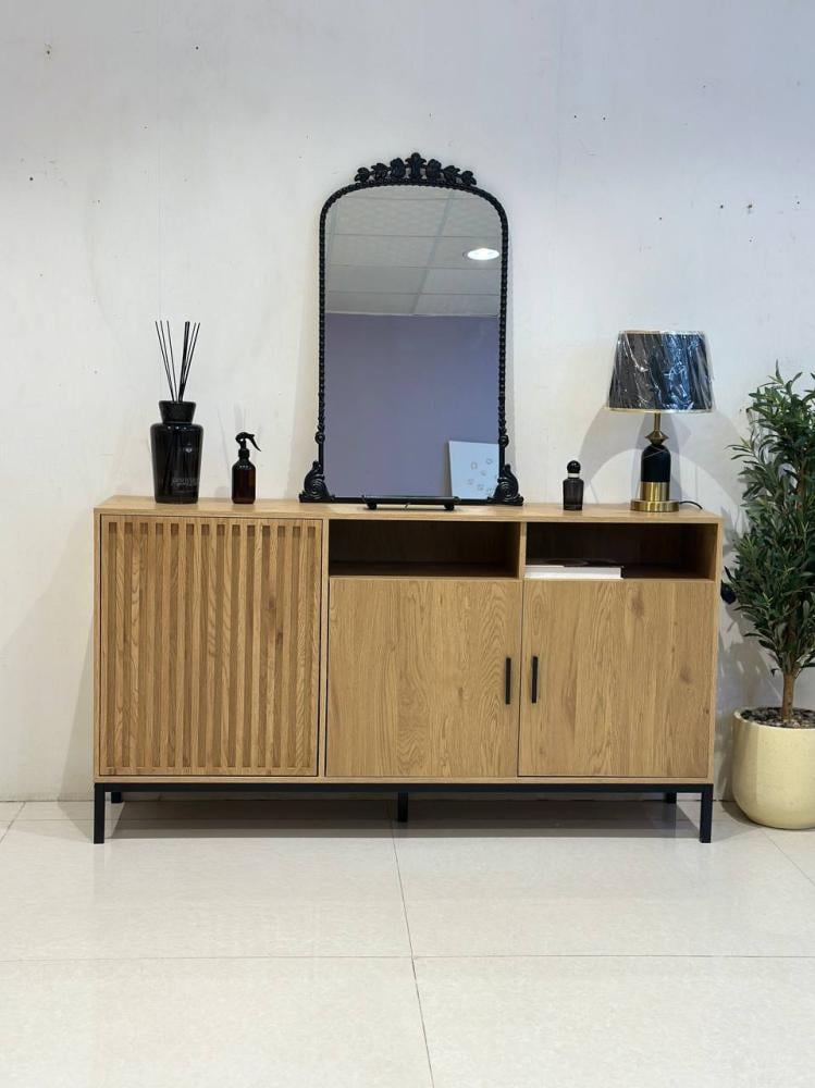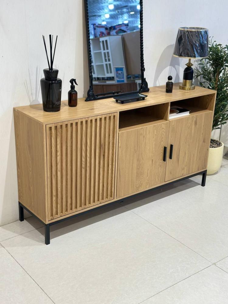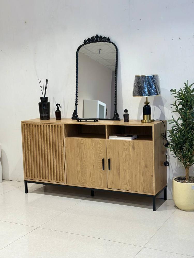 هذا البوفيه الأنيق هو إضافة مثالية لأي مساحة عصرية أو كلاسيكية. يتميز سطحه المصنوع من الخشب بلونه البيج الهادئ، مما يضفي لمسة من الفخامة والدفء على المكان.