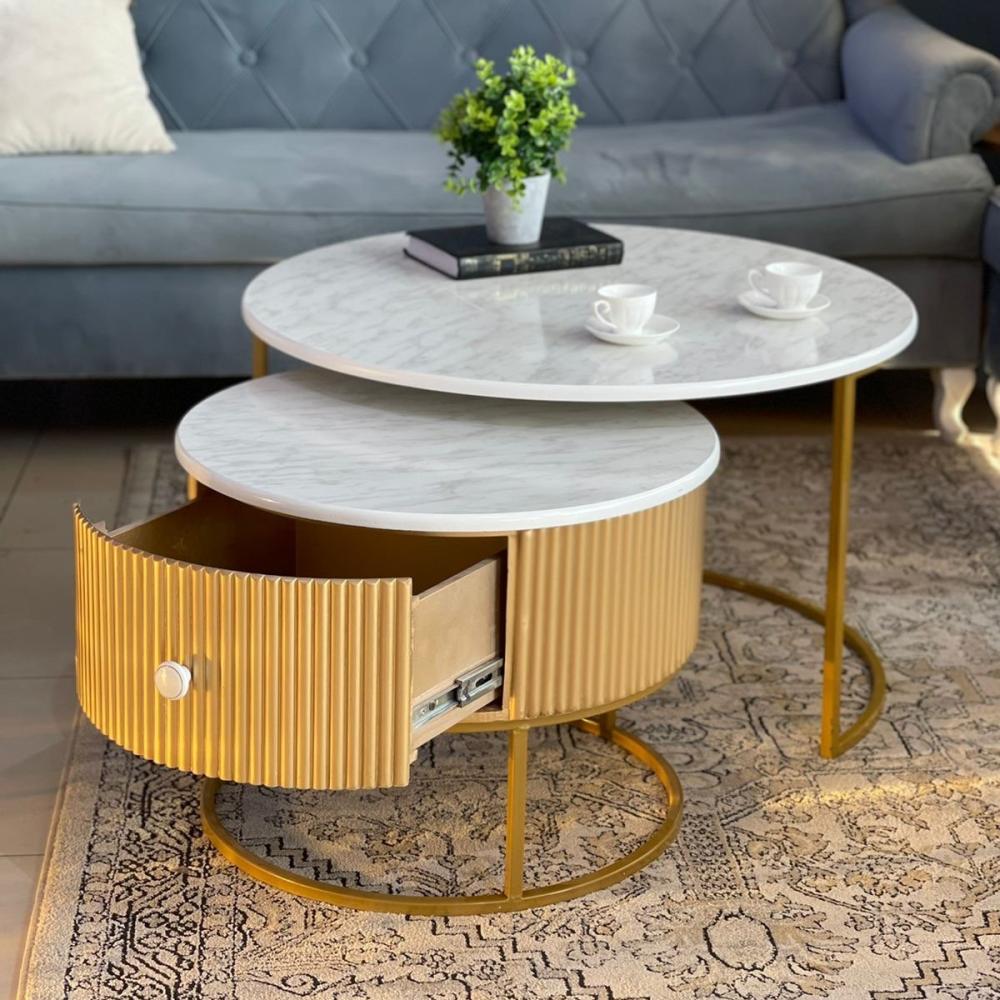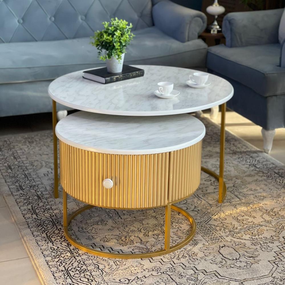 طاولات ذهبي رخام يتميز هذا الطقم بالجمال والأناقة والتصميم الرائع تتميز الطاولات بسطح خشب شكل رخام ناعم مزودة بدرج مما يمنحها الأناقة والفخامة التي تحتاجها لمنزلك، كما يتميز الطقم باللون الذهبي الفاخر المستخدم لإضفاء الرونق والتألق في مناطق الجلوس والاستراحة تم صُنع الطقم باستخدام تقنية الفرن الحراري المتطورة لإضفاء المتانة والصلابة.