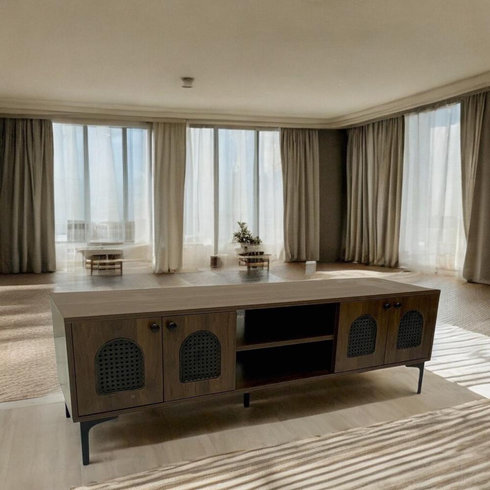 - الخامة: مصنوعة من خشب فائق الجودة ومزين بتفاصيل منسوجة يدويًا من الروتان لتوفير مظهر دافئ وأنيق.