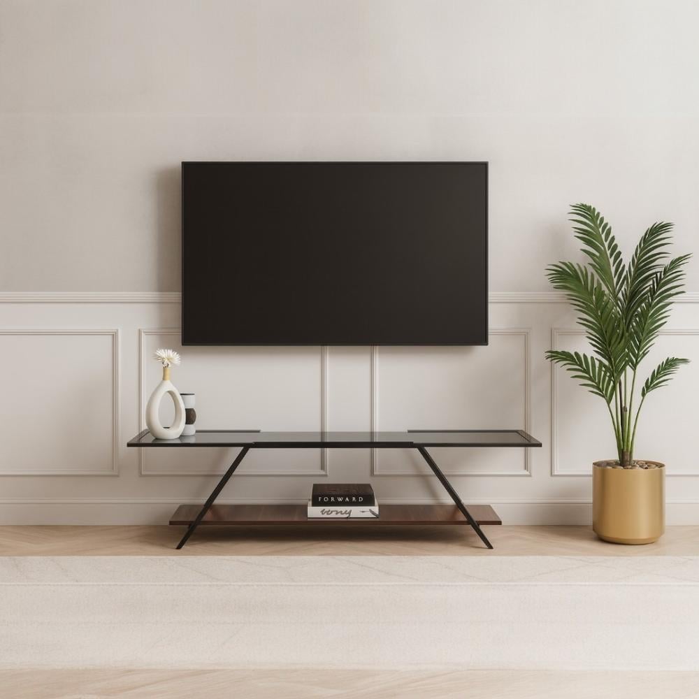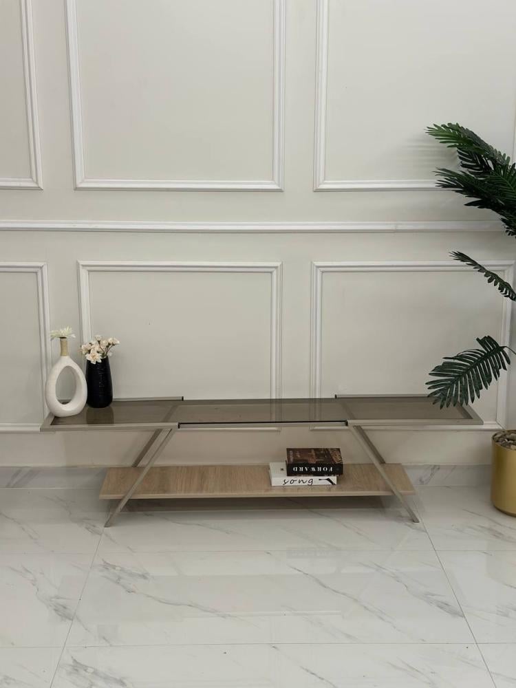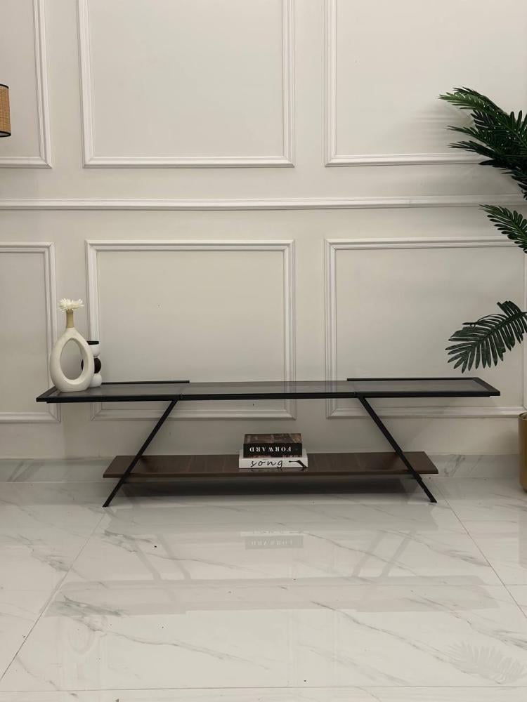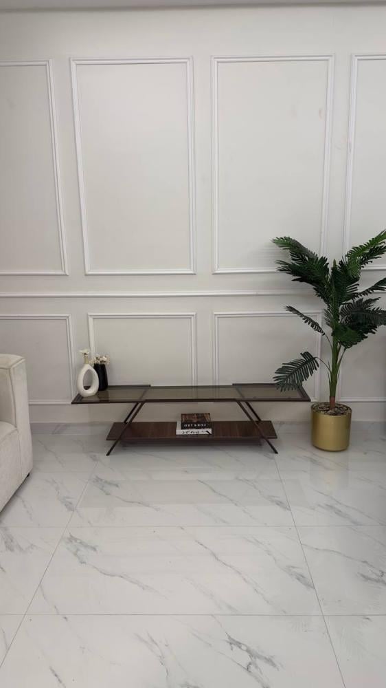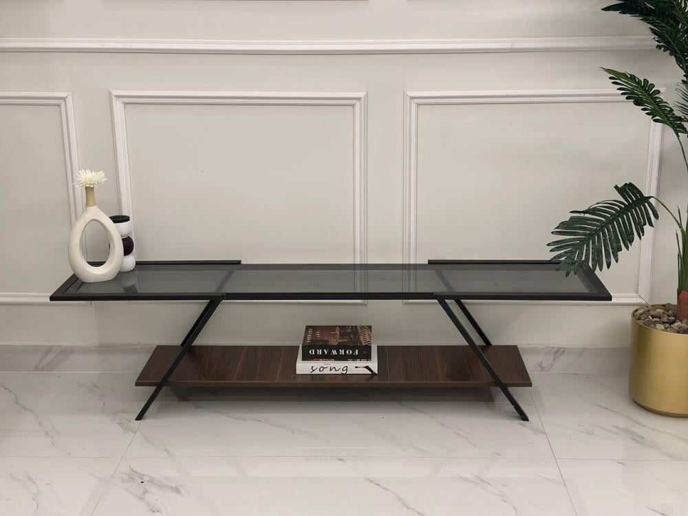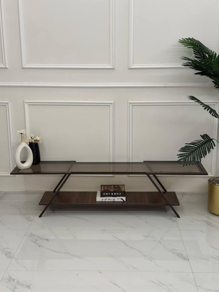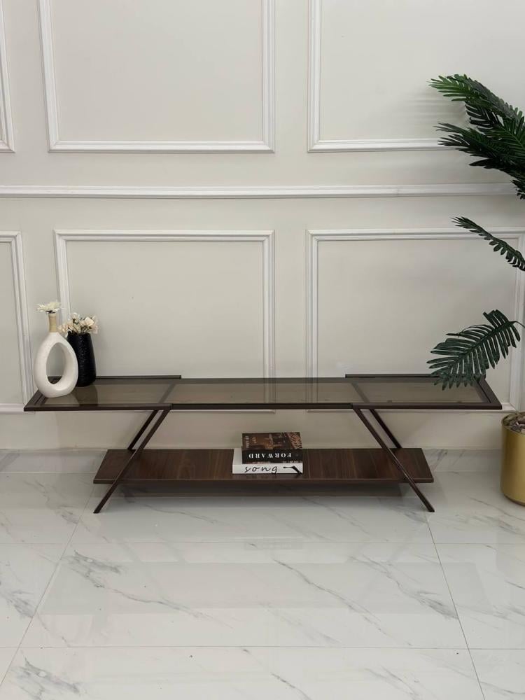 • تصميم مبتكر بدورين: السطح العلوي من الزجاج البني الشفاف يمنح إحساسًا بالرحابة والحداثة، بينما يضفي الرف السفلي المصنوع من الخشب البني لمسة دافئة ويوفر مساحة مثالية لترتيب الأجهزة أو مستلزمات الديكور.