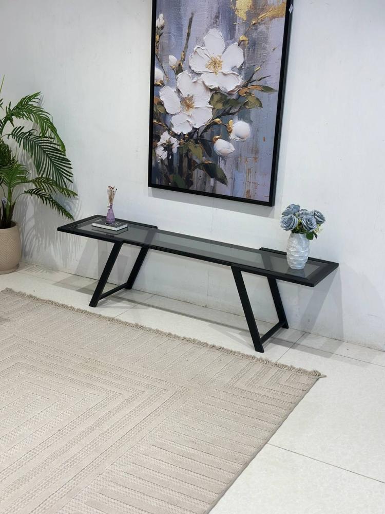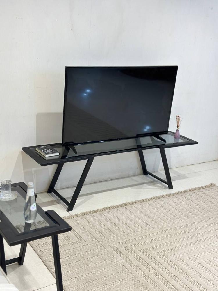 - طاولة تلفزيون قزاز مصنوعة من حديد مطلي بالأسود المطفي لضمان المتانة والمظهر العصري في نفس الوقت.