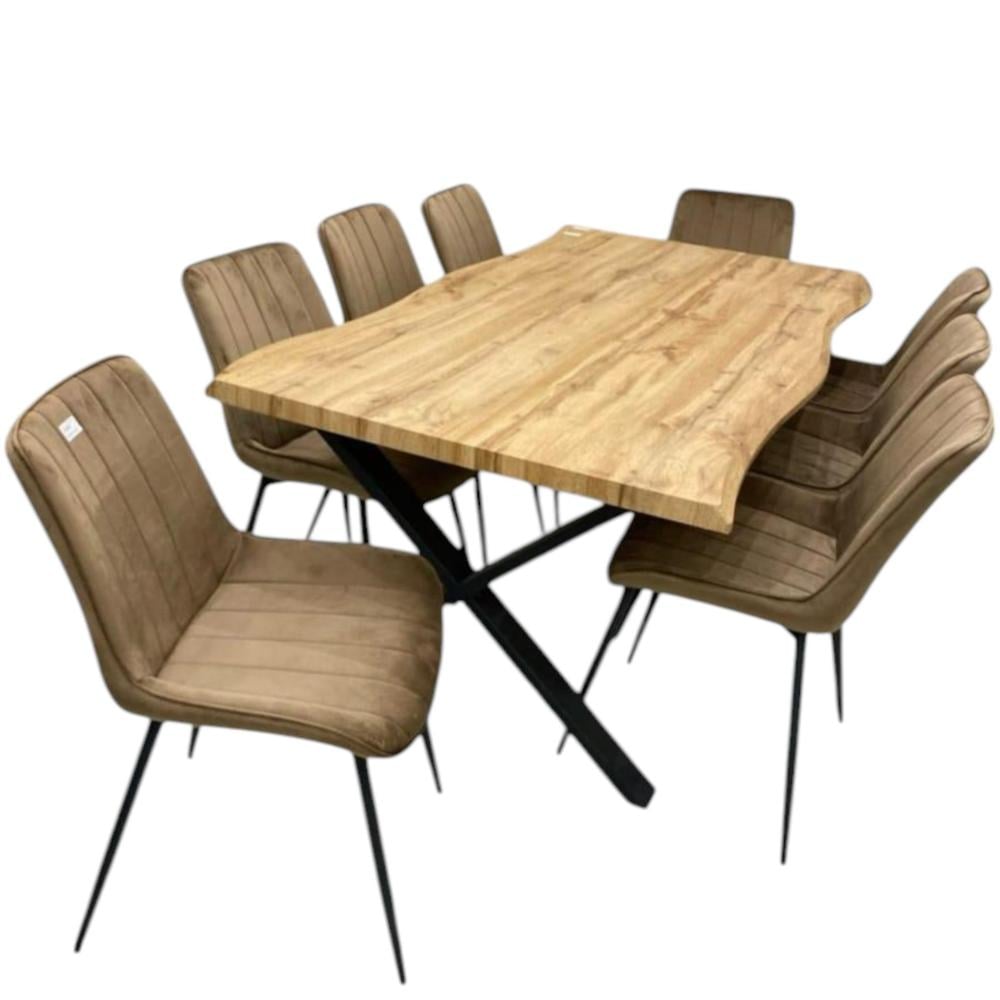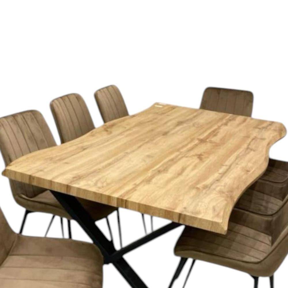 اجعل غرفة الطعام الخاصة بك تحفة فنية مع هذه الطاولة العصرية التي تجمع بين سطح خشبي دافئ وقواعد معدنية سوداء قوية. مثالية للجمع بين العملية والأناقة، هذه الطاولة تتسع لـ 8 كراسي لتناسب العائلات الكبيرة أو الاجتماعات الرسمية مع الضيوف.
