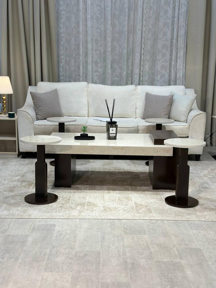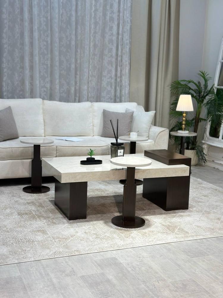 أضف لمسة فاخرة إلى مجالسك مع هذا الطقم المميز الذي يجمع بين سطح بديل الرخام الأبيض الفاخر والقواعد الخشبية البنية الداكنة ذات التشطيب الأنيق. يتكون الطقم من طاولة قهوة مركزية مستطيلة التصميم، تحيط بها طاولات جانبية مستديرة عملية تناسب جميع احتياجاتك.