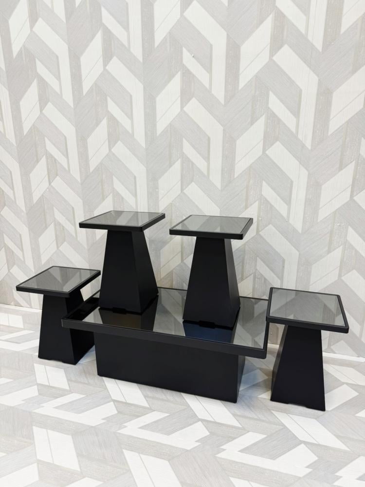 أضف لمسة من الفخامة العصرية إلى منزلك مع هذا الطقم المميز، المكوّن من طاولة رئيسية وأربع طاولات خدمة بتصميم أنيق يجمع بين اللون الأسود الراقي و السطح الزجاجي العاكس مع المرايا لإضفاء إطلالة فاخرة على أي ركن من أركان المنزل.