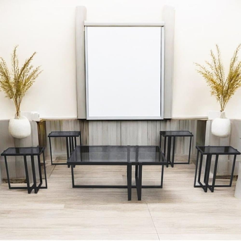 طقم فاخر بتصميم عصري يخطف الأنظار! سطح زجاجي أسود لامع يعكس الإضاءة بشكل جذاب وقاعدة متينة تضمن الأناقة والثبات معاً.