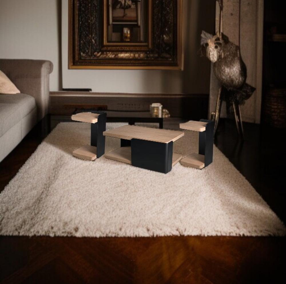 • طقم متكامل يتكوّن من طاولة ضيافة رئيسية + طاولتين خدمة متناسقتين.