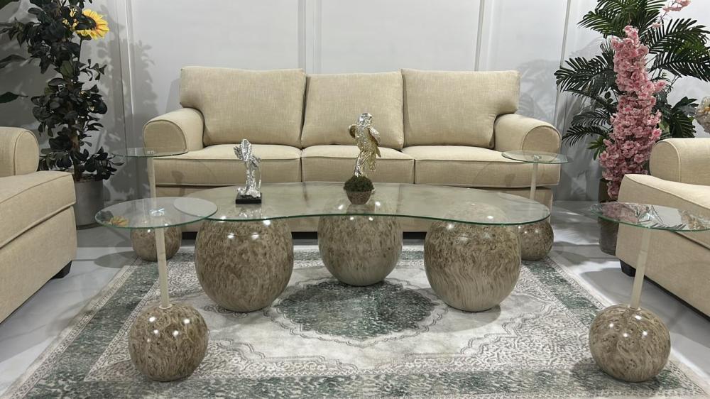 أضف لمسة عصرية وفاخرة إلى مجلسك مع طقم طاولات "كور" المميز، بتصميم زجاجي شفاف يعكس الأناقة والبساطة في آنٍ واحد. الطاولة الرئيسية تأتي بتصميم كروي أو دائري راقٍ، يرافقها 4 طاولات خدمة عملية يمكن تنسيقها بسهولة.