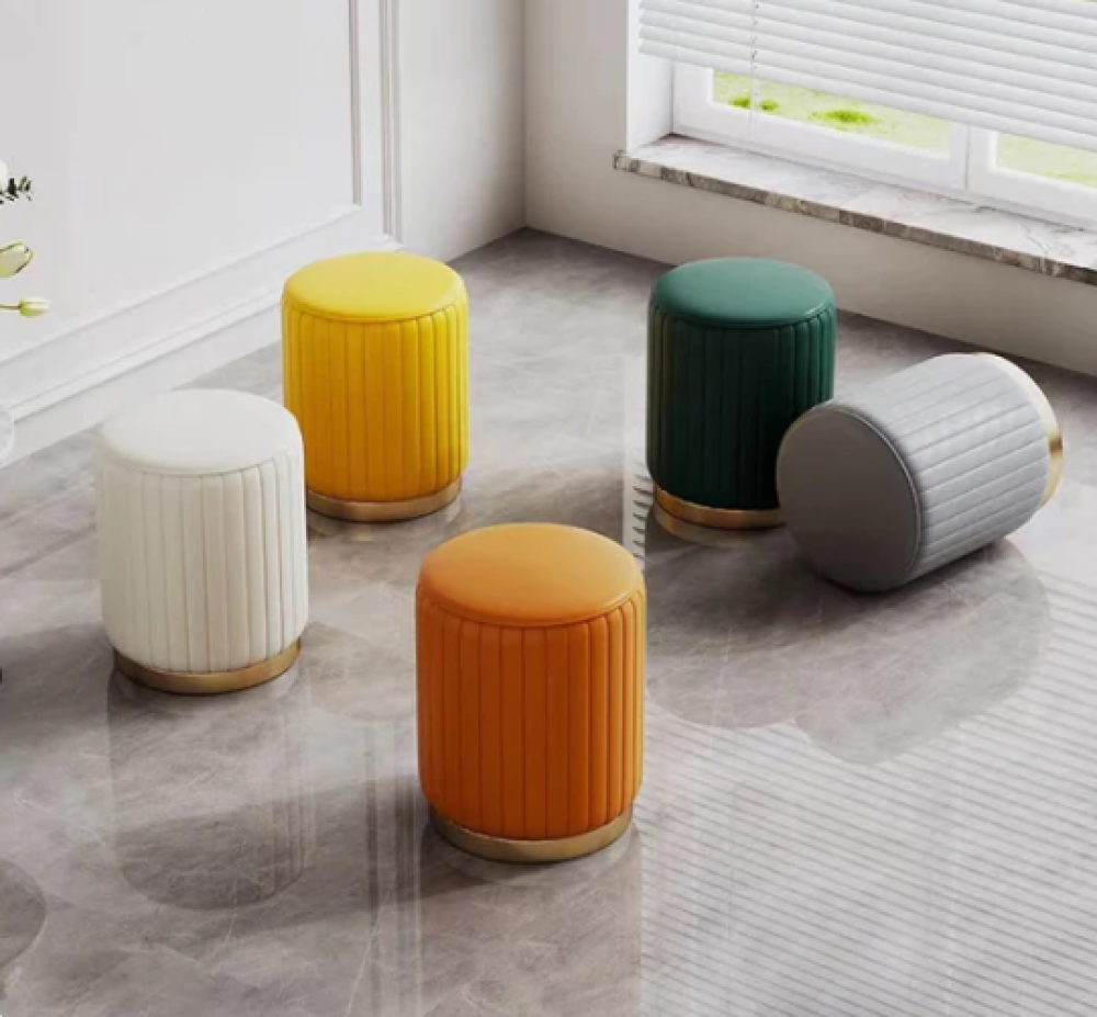بف جلدي دائري بقاعدة معدنيه مصنوع من اجود انواع الجلود والمعدن عالي الجودة و متاح الرمادي و الاخضر و الأصفر و الأبيض و البرتقالي و متوفر بمقاس ارتفاع 42سم و عرض 32سم و يمكن استخدامها في المنزل و الفنادق و ايضا المطاعم