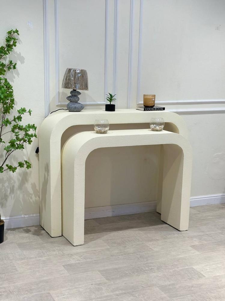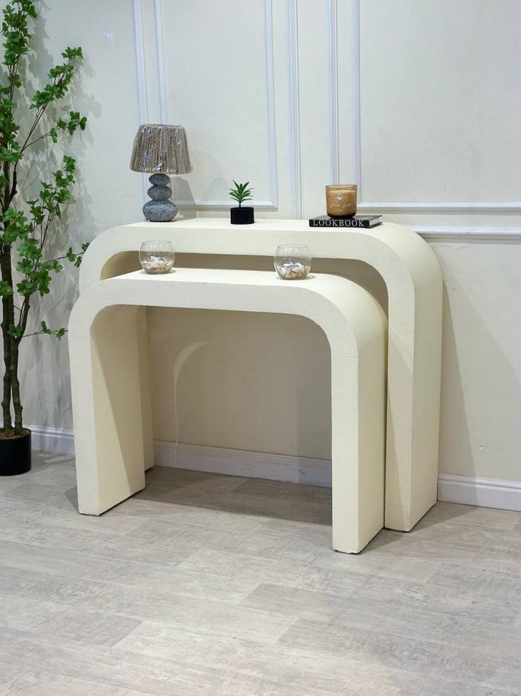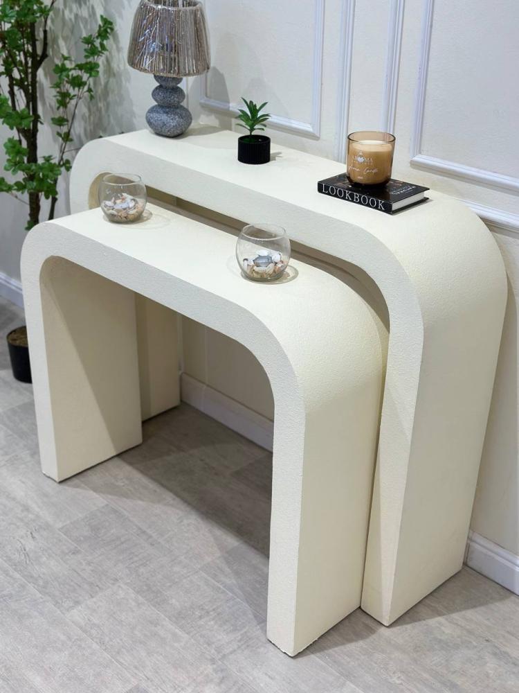 أضف لمسة من الرقي والجاذبية إلى مدخل منزلك مع طاولة الاستقبال المقوسة ذات التصميم العصري والأنيق. تأتي هذه الطاولة بلون سكري (بيج فاتح) هادئ ينسجم مع مختلف أنماط الديكور الداخلي، وتضفي إحساسًا بالاتساع والدفء على المكان.
