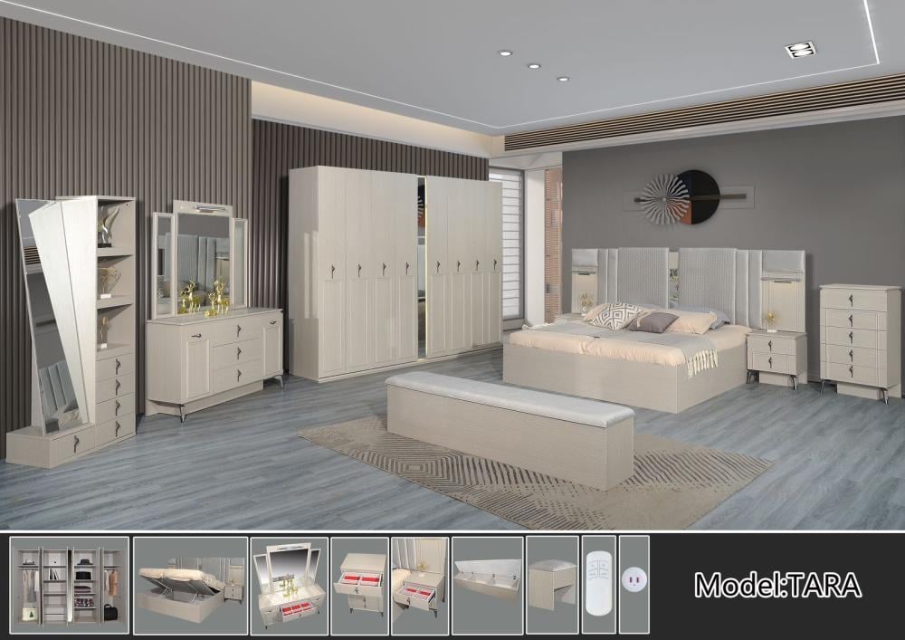 غرفة نوم صيني. :موديل : تارا. ٩ قطع. يوجد شاحن USB. تخزين في السرير والاريكة. اريكة. استاند مراية.أبواب هدروليك.
